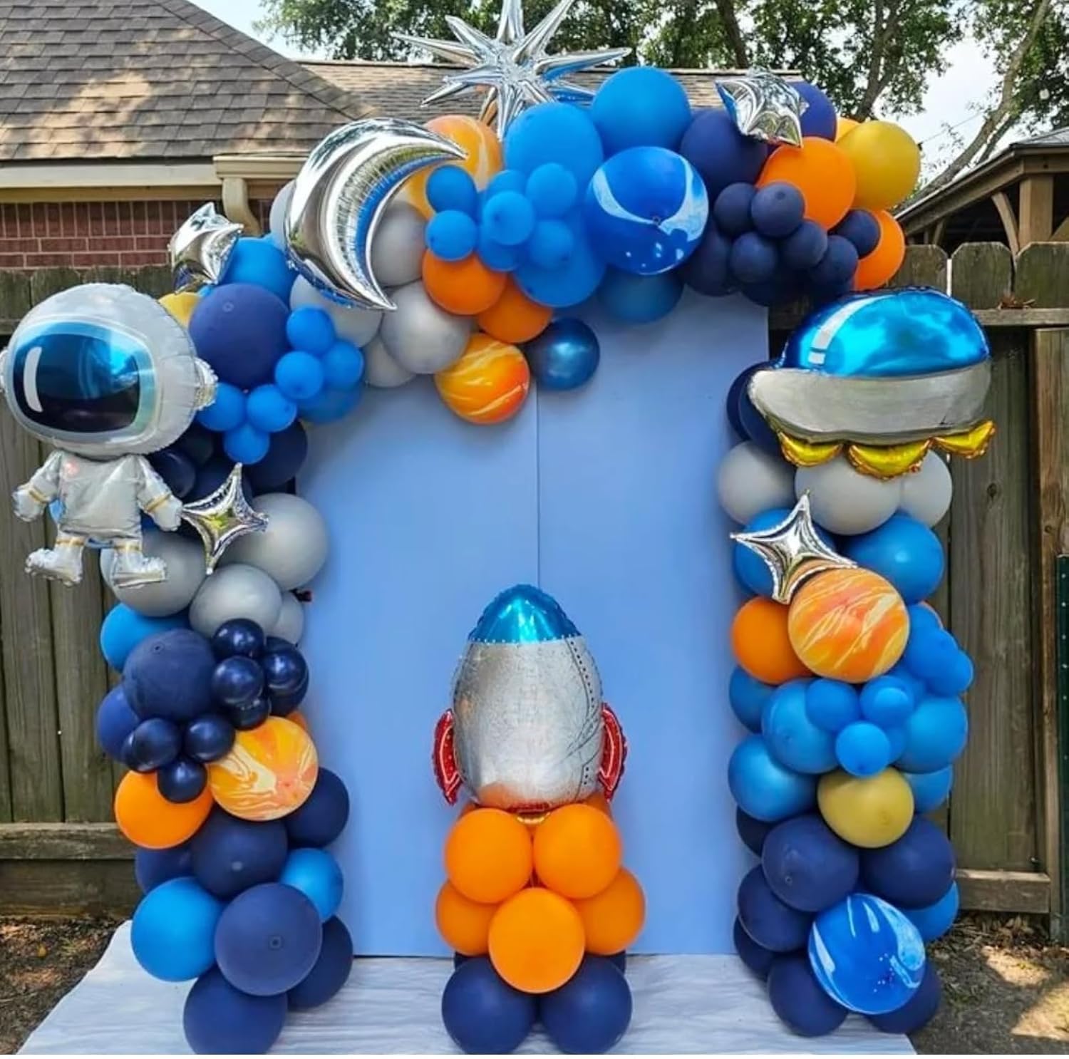 • 12 Inch Space Balloon Set: 5 x metallic silver balloons, 8 x orange balloons, 5 x pearl night blue balloons, 5 x metallic midnight blue balloons, 3 x metallic blue balloons, 2 x 10-inch agate yellow balloons, 2 x 10-inch agate blue balloons, and 1 x blue ribbon. This cosmic combination of orange and blue balloons is ideal for creating a space-themed party or celebration.
