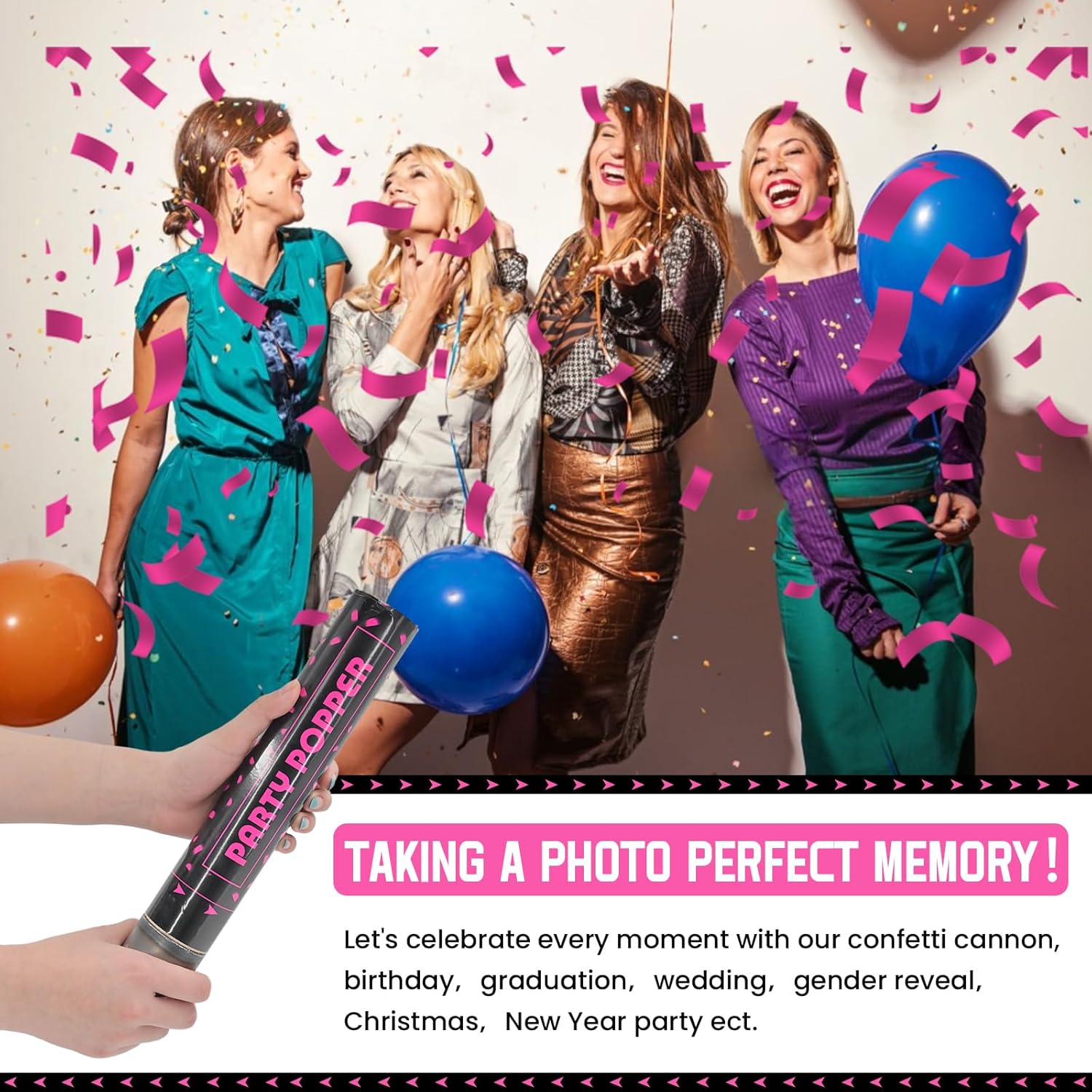 • Party Poppers with Pink Confetti - Our pink mylar confetti poppers are made of high quality confetti, ensuring a celebartion that's both fun and safe. Ideal for any occasion, form weddings and engagements to birthdays and baby shower, graduation Christmas New Year party.