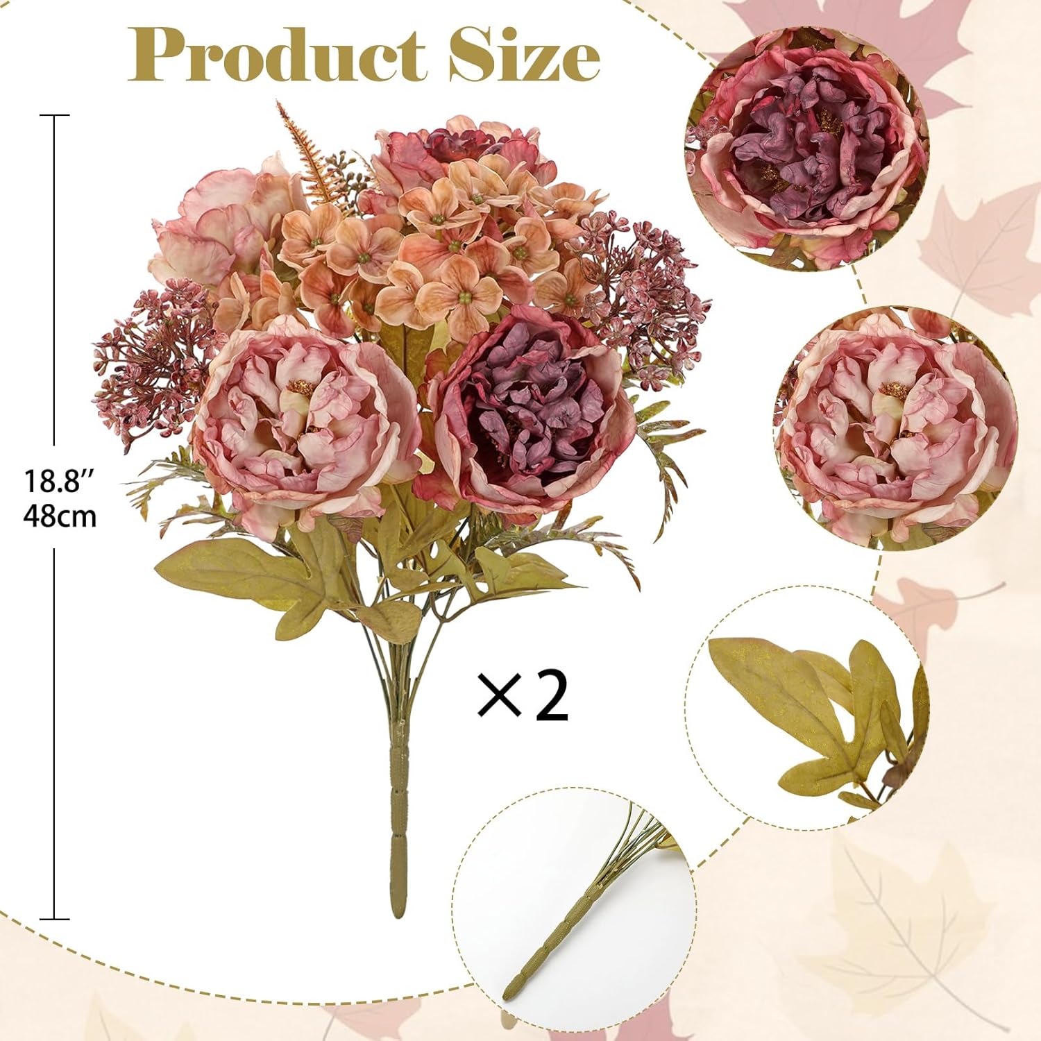 • Package Content: Include 2 bunches of fall flowers artificial for decoration, about 18.8 inches tall, each containing 4 fall pink peonies, 2 pink hydrangea, 2 plastic red hydrangea and some ferns leaves for embellishments