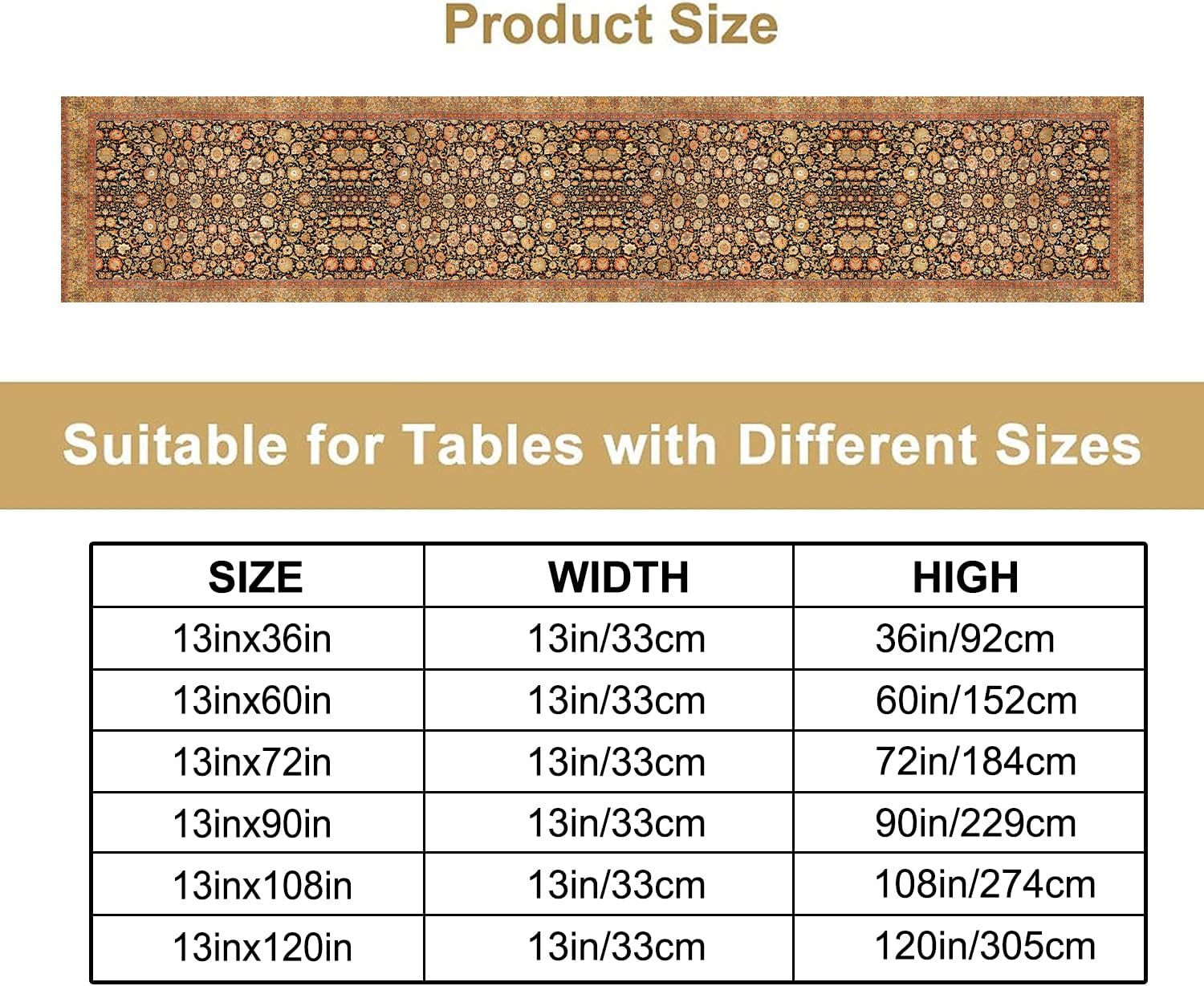• Product Size : This tablecloth is 13 in ( 33 cm ) x 108 in ( 274 cm ), suitable for tables that can accommodate 8-10 people,better match your table and give you a pleasant dining experience