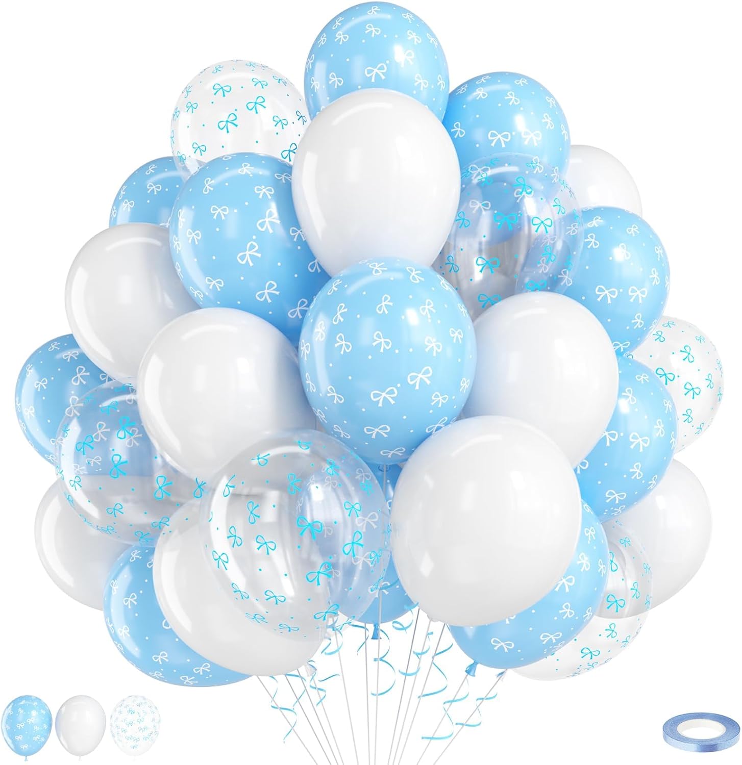 • 12 Inch Blue Bow Balloon Set: 10 x dusty blue bow print balloons, 10 x transparent bow print balloons, 10 x white balloons, and 1 x light blue ribbon. The elegant combination of blue and white is ideal for adding a touch of sophistication to any celebration.