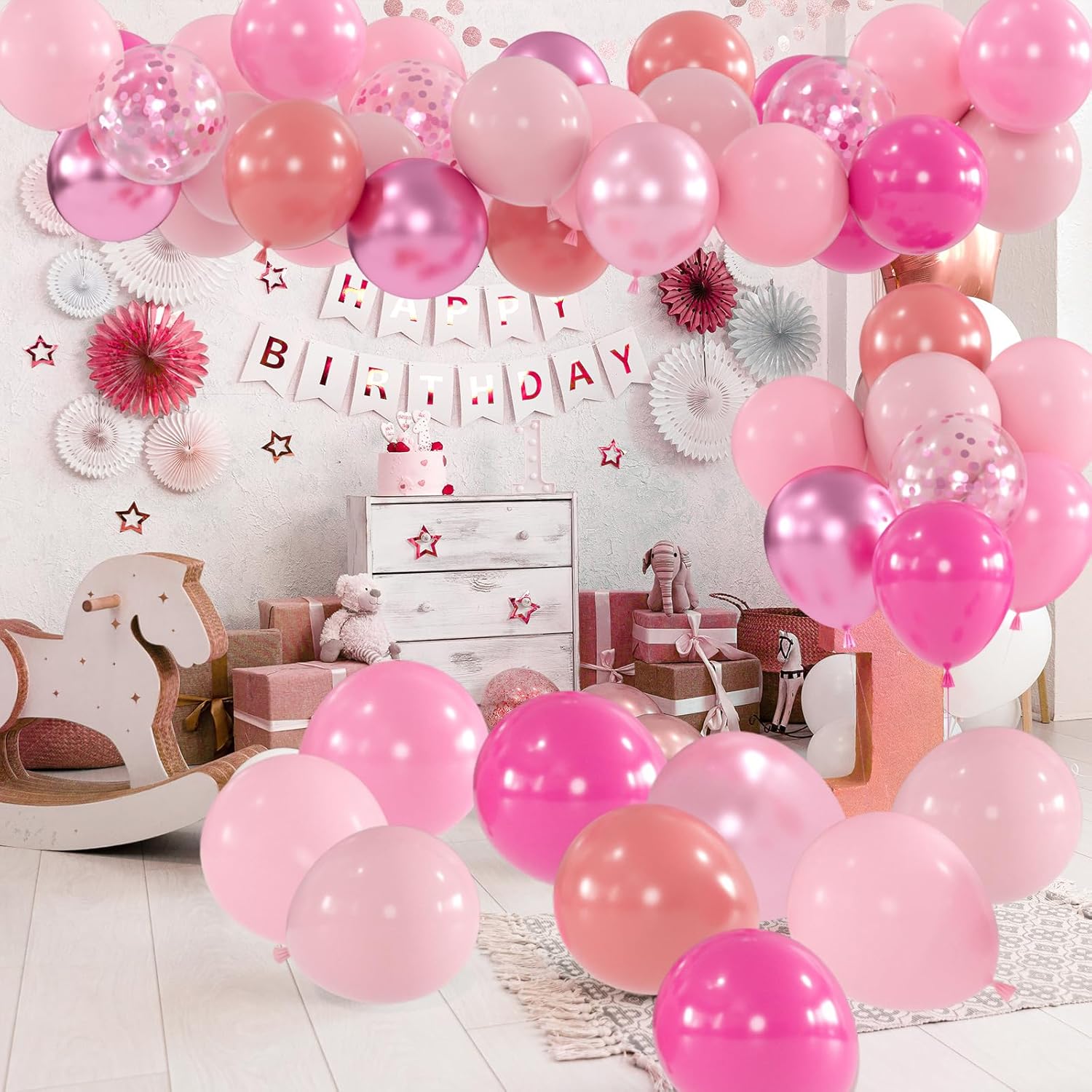 • Pink Party Balloons Kit : Come with 100pcs in 9 assorted pink balloons, Includes 15 Magenta Pink balloons, 15 metallic pink balloons, 10 hot pink balloons, 10 pastel pink balloons, 10 pearl pink balloons, 10 baby pink balloons, 10 dusty pink balloons, 10 macaron pink balloons, 10 pink confetti balloons, 2 balloon ribbons. All the balloon size is 12 inches after inflation.