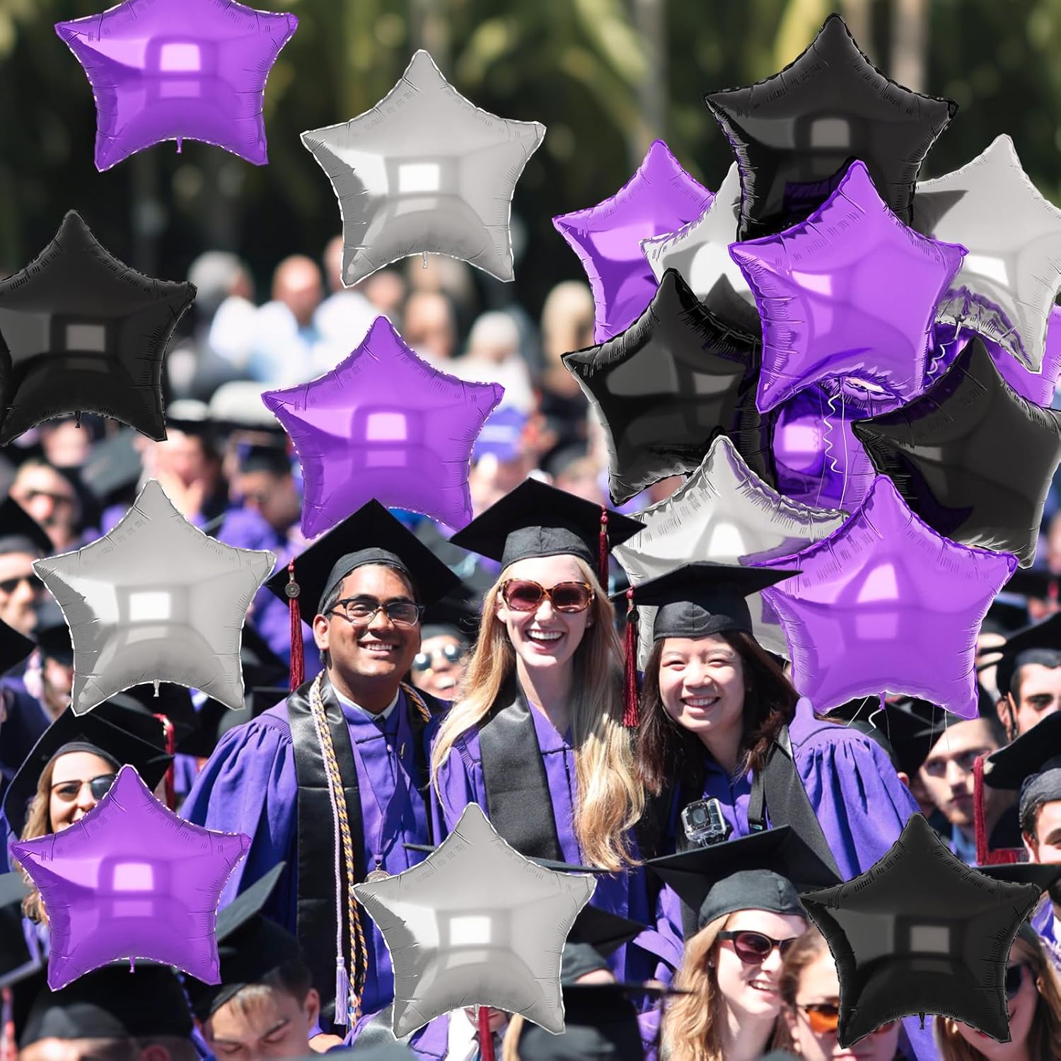 • Black Purple and Silver Stars Party Balloons: This 12Pcs purple black foil star balloons set designed with Giant 18 inch pentagram foil balloons, includes purple star mylar balloons, black star mylar balloons and silver star mylar balloons, each balloons set comes with a straw and ribbon