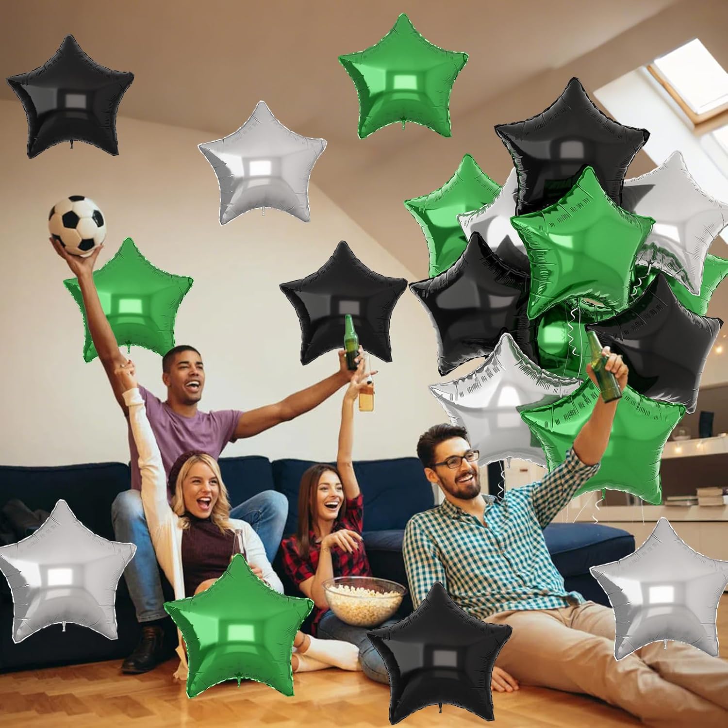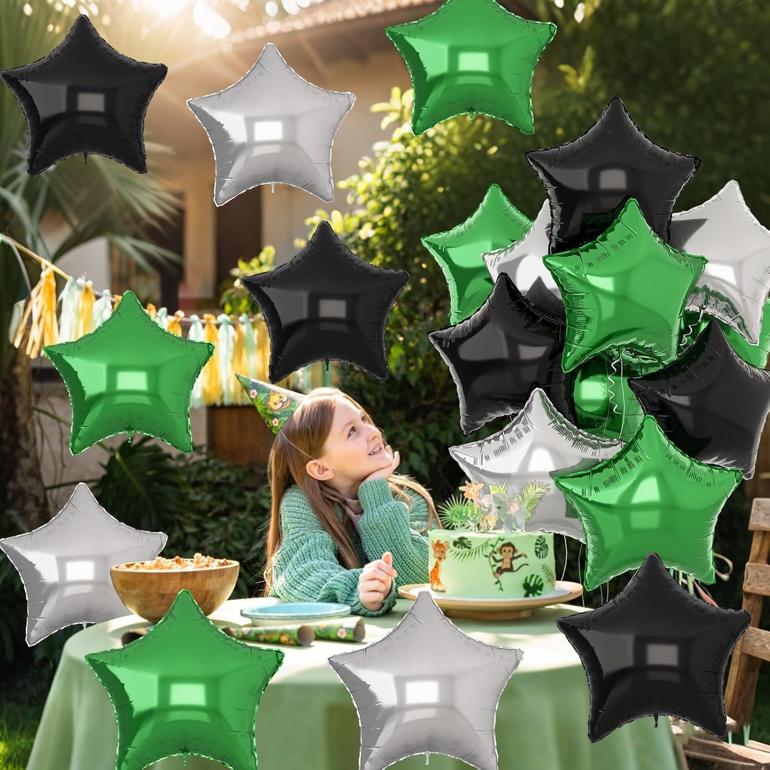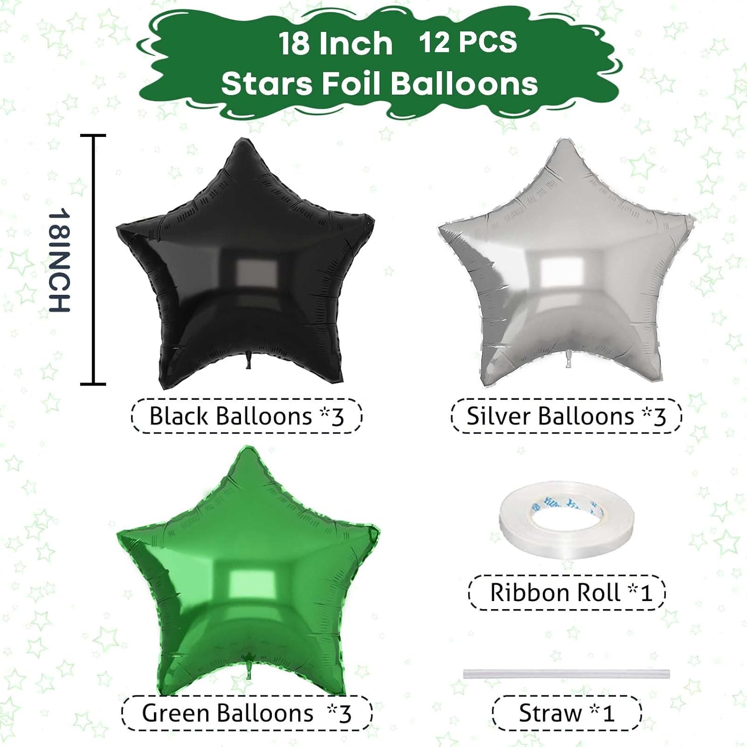 • Black Green and Silver Stars Party Balloons: This 12Pcs green black foil star balloons set designed with Giant 18 inch pentagram foil balloons, includes green star mylar balloons, black star mylar balloons and silver star mylar balloons, each balloons set comes with a straw and ribbon