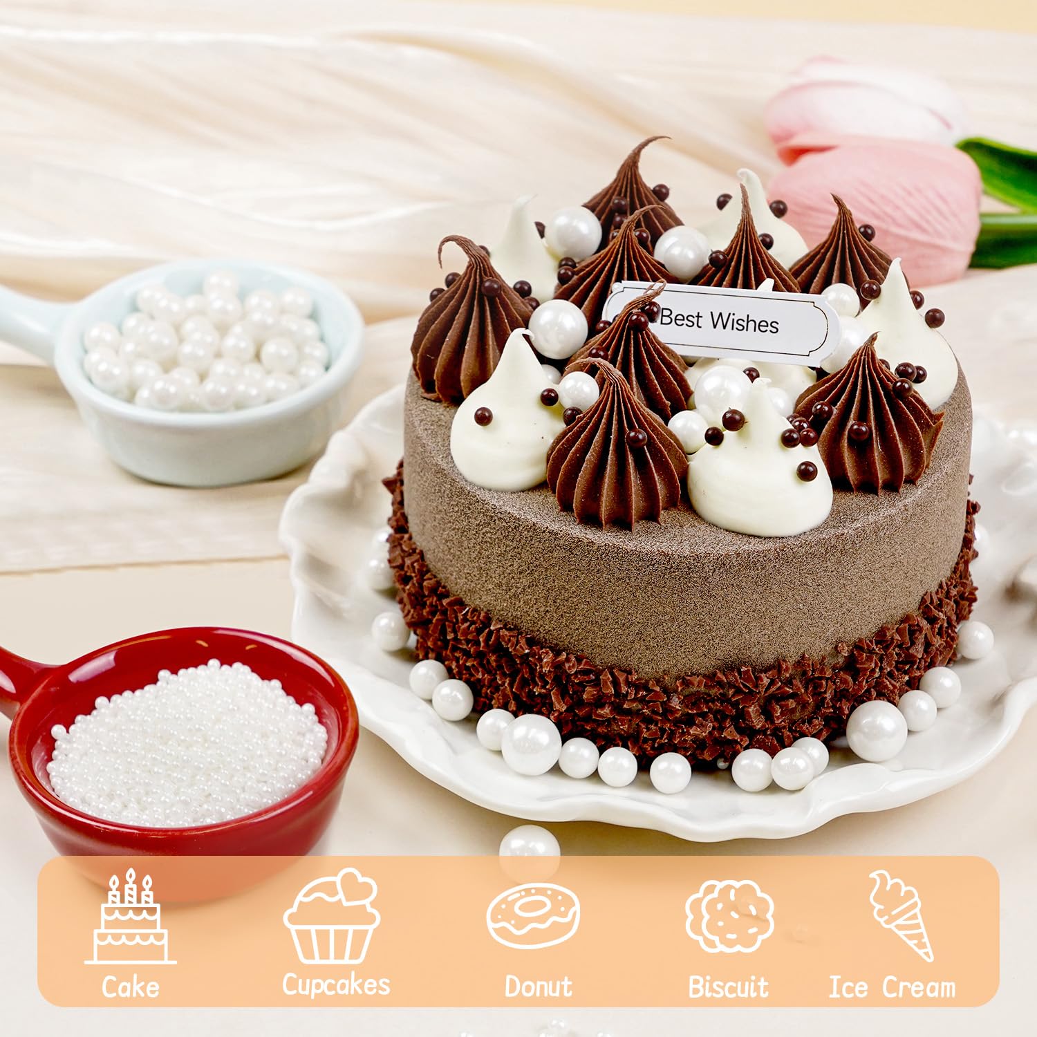 • Net Weight: 150g/5.29oz. The White Pearl Sprinkles can bring an excellent decorative effect to your desserts. White Pearl Sugar can make your baking more perfect, these pearl Sprinkles can be used to decorate Cake toppers, Cupcakes, Cookies, Chocolates, Doughnuts, Ice cream and more. Each Slightly Sweet Pearl Sprinkles has a smooth and round surface and a delicate texture.