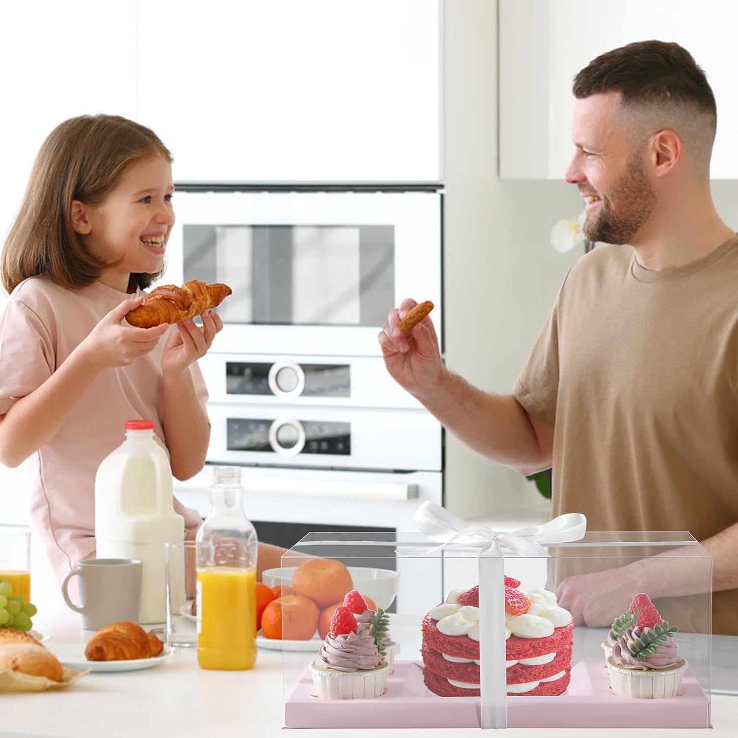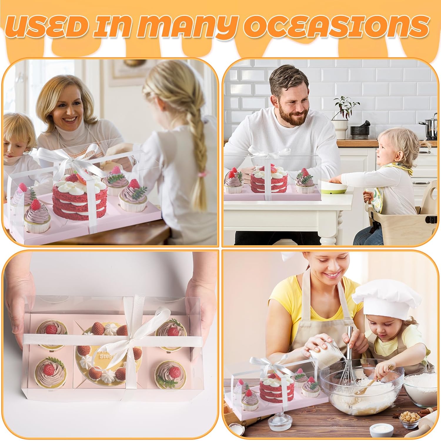 • Package Includes:3pcs clear cupcake boxes + 3pcs inserts + 1 roll ribbon.The paper inserts keep the cupcakes stay in place from moving around. The cake box has a wide viewing angle, perfect for showcasing cakes while protecting them. It is a great choice for making cupcakes and pastries.