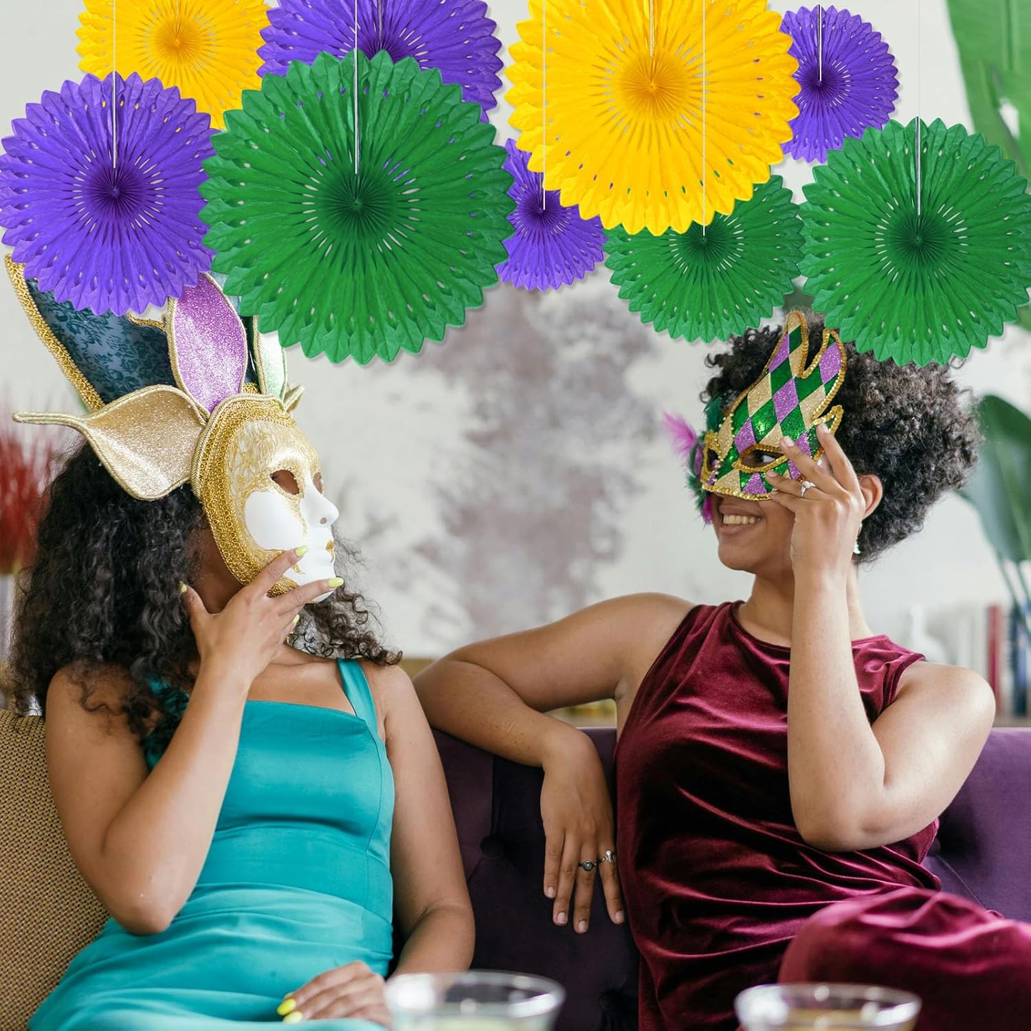 18 Pcs Mardi Gras Hanging Honeycomb Paper Fans, Round Paper Fan Decorations for Weddings, Birthdays, Bachelorette, Photo Booth Backdrops, Baby Shower, Anniversary Events Party Supplies