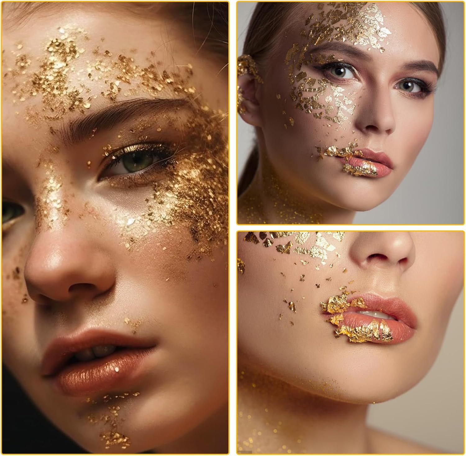 • EDIBLE GOLD FLAKES: Gold leaf for baking can create a stunnings sparkling effect, can make your crafts look unique and compatible with various foods. Imitation gold flakes also perfect for interior design, arts and crafts or metal gilding work, sculpture etc.