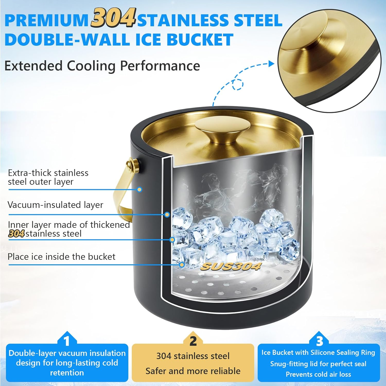 • 【MULTIPLE ACCESSORIES】Everything you need for chilling,ice bucket comes with an ice scoop,Ice Tongs,Removable filter layer,and even the Rapid-Freeze Whiskey Stones as you choose.