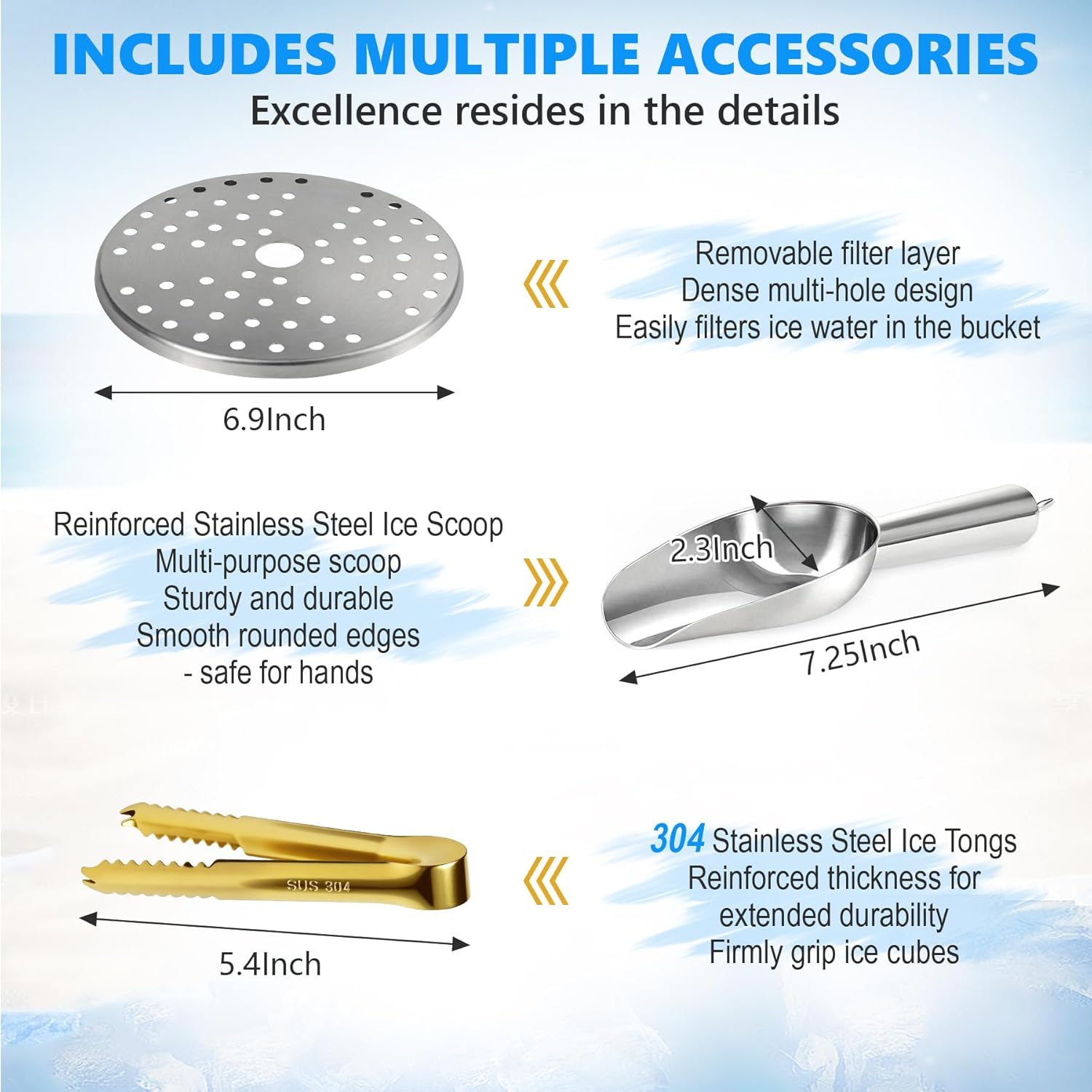 • 【MULTIPLE ACCESSORIES】Everything you need for chilling,ice bucket comes with an ice scoop,Ice Tongs,Removable filter layer,and even the Rapid-Freeze Whiskey Stones as you choose.