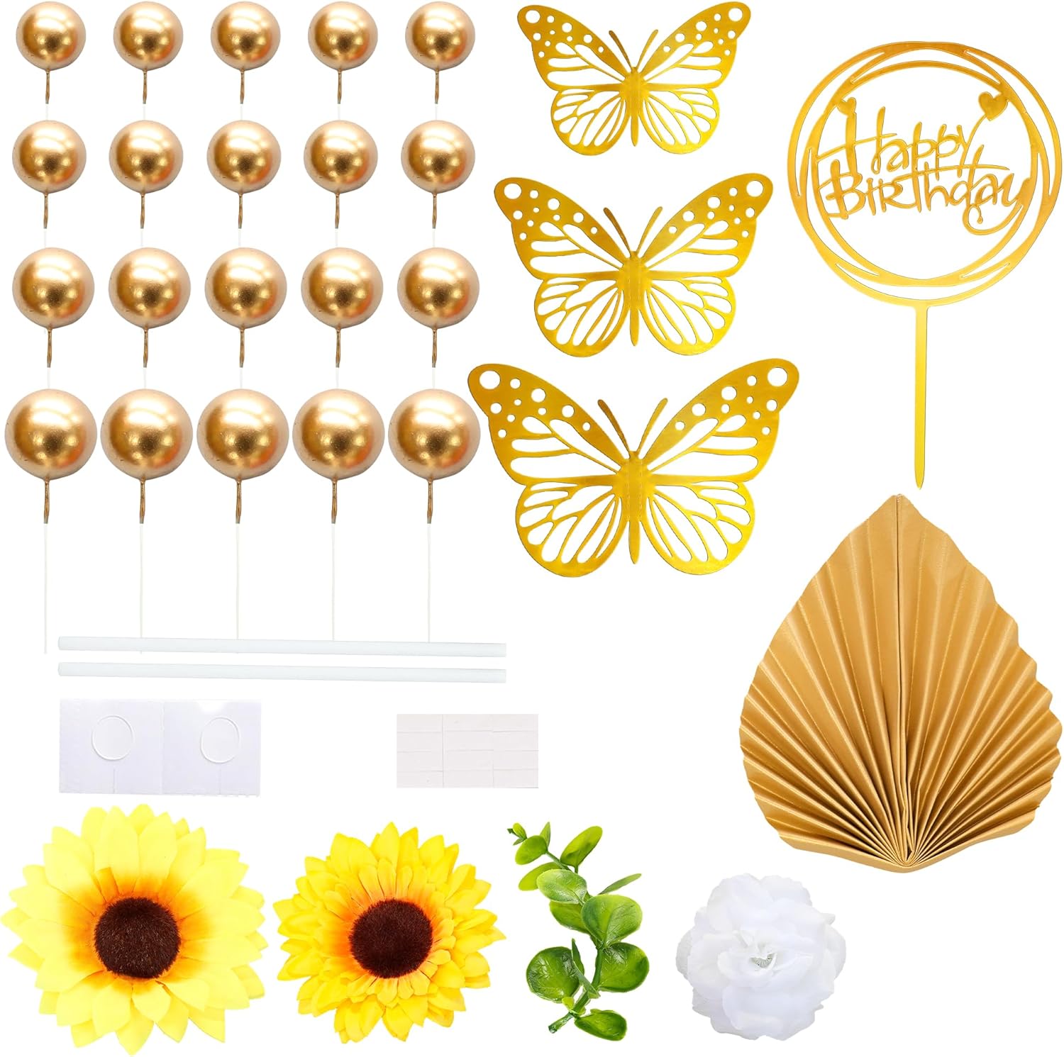 • -Package included: 12Pcs Butterflies + 6Pcs Artificial Flower + 1Pcs Happy Birthday Cake Topper + 2Pcs Palm Fans + 5Pcs Leaves Cake Toppers + 28Pcs Balls. These Artificial Sunflower Cake Toppers are so chic and funny that make your Bridal Shower theme party a big hit.