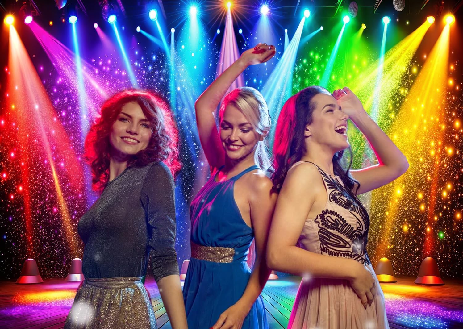 • 🎉 Vibrant Rainbow Light Design – Featuring a dazzling array of rainbow spotlights and glitter effects, this backdrop instantly creates a festive atmosphere for parties, concerts, or photoshoots.