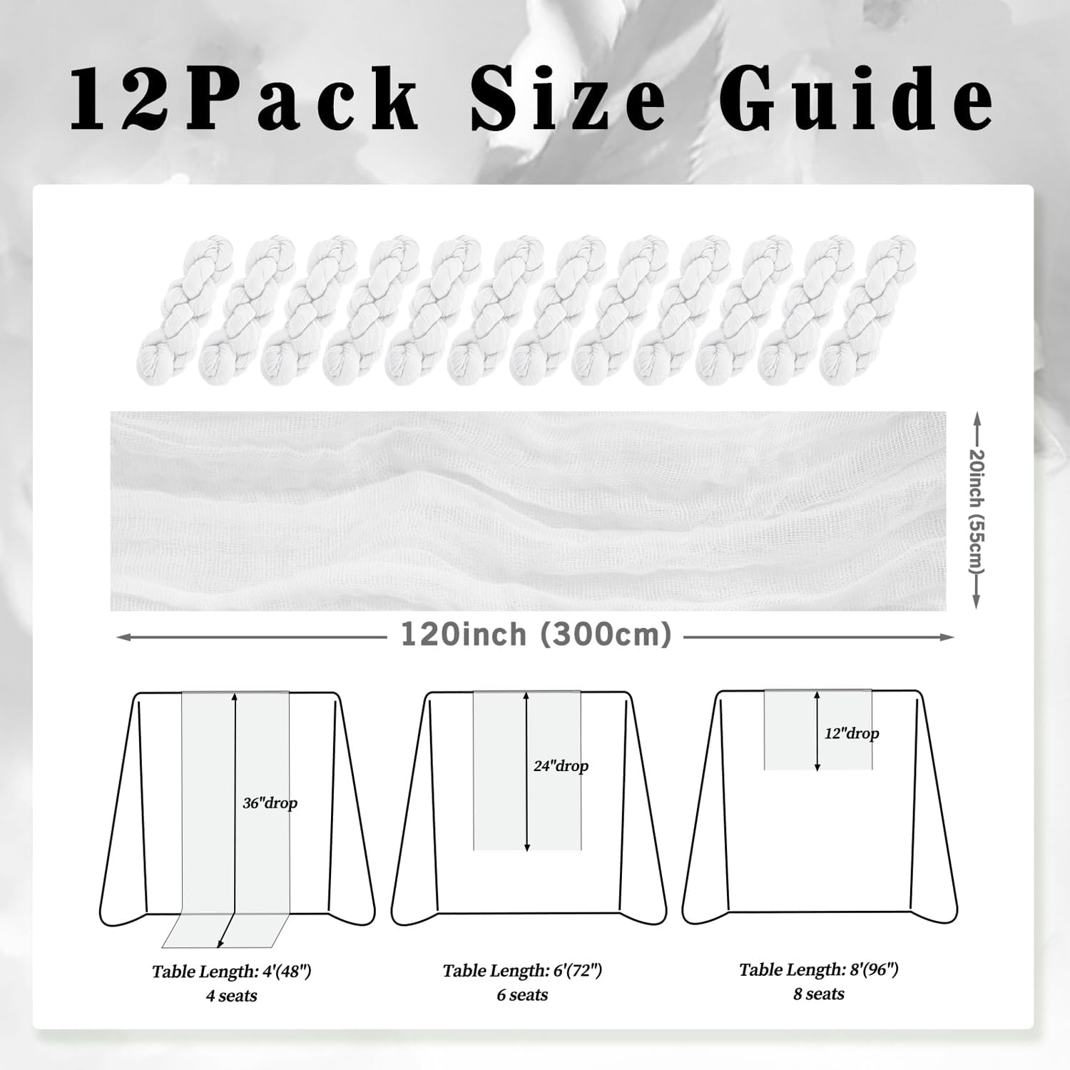10FT 12 Pack White Cheesecloth Table Runner 20 x 120 Inch Long Rustic Gauze Cheese Cloth Table Runner for Wedding Bridal Baby Shower Table Decorations Boho Fabric Sheer Birthday Party Table Decor