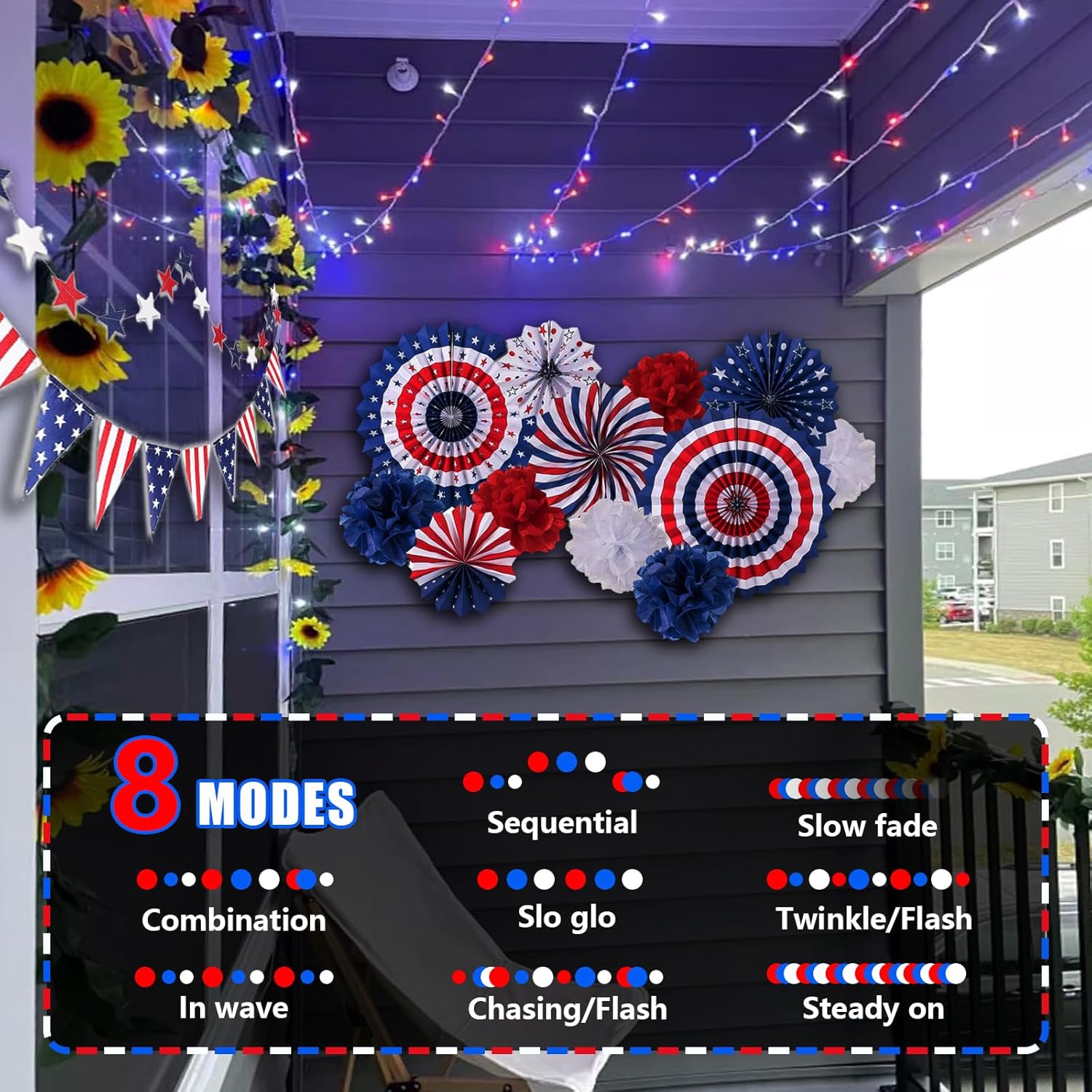 • 4th of July Decoration Lights: 165ft 500 LED string lights will take your holiday to a new level. The 9.8ft long lead wire, allowing to plug in the light far away from your house or tree. It is well made and tangle free. Clear cord is thin, it would blend in better with forth of July Decorations. Perfect for Independence Day.