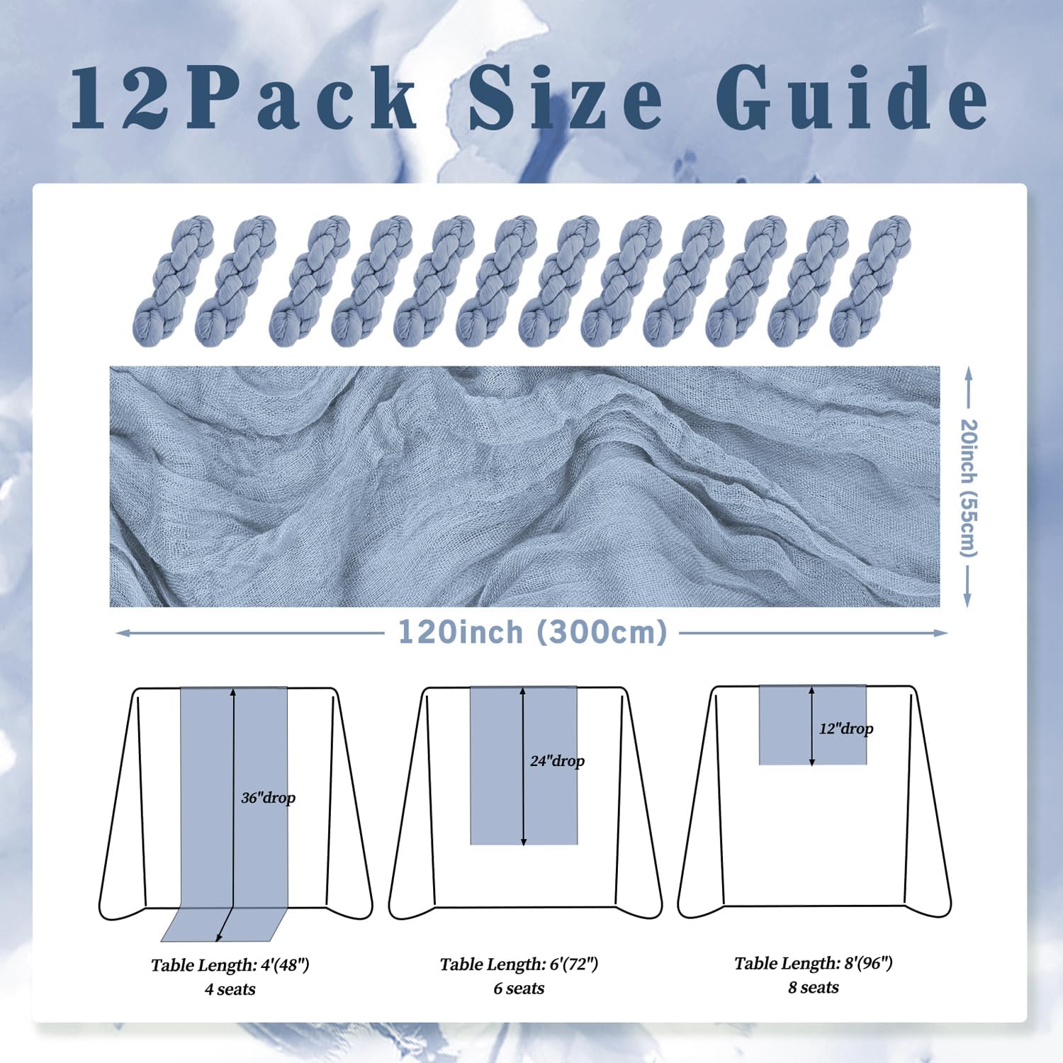 12 Pack Dusty Blue 10FT Cheesecloth Table Runner Rustic Gauze Fabric Cheese Cloth Table Runner for Wedding Bridal Baby Shower Table Decor 20 x 120 Inch Long Boho Sheer Birthday Party Table Decorations