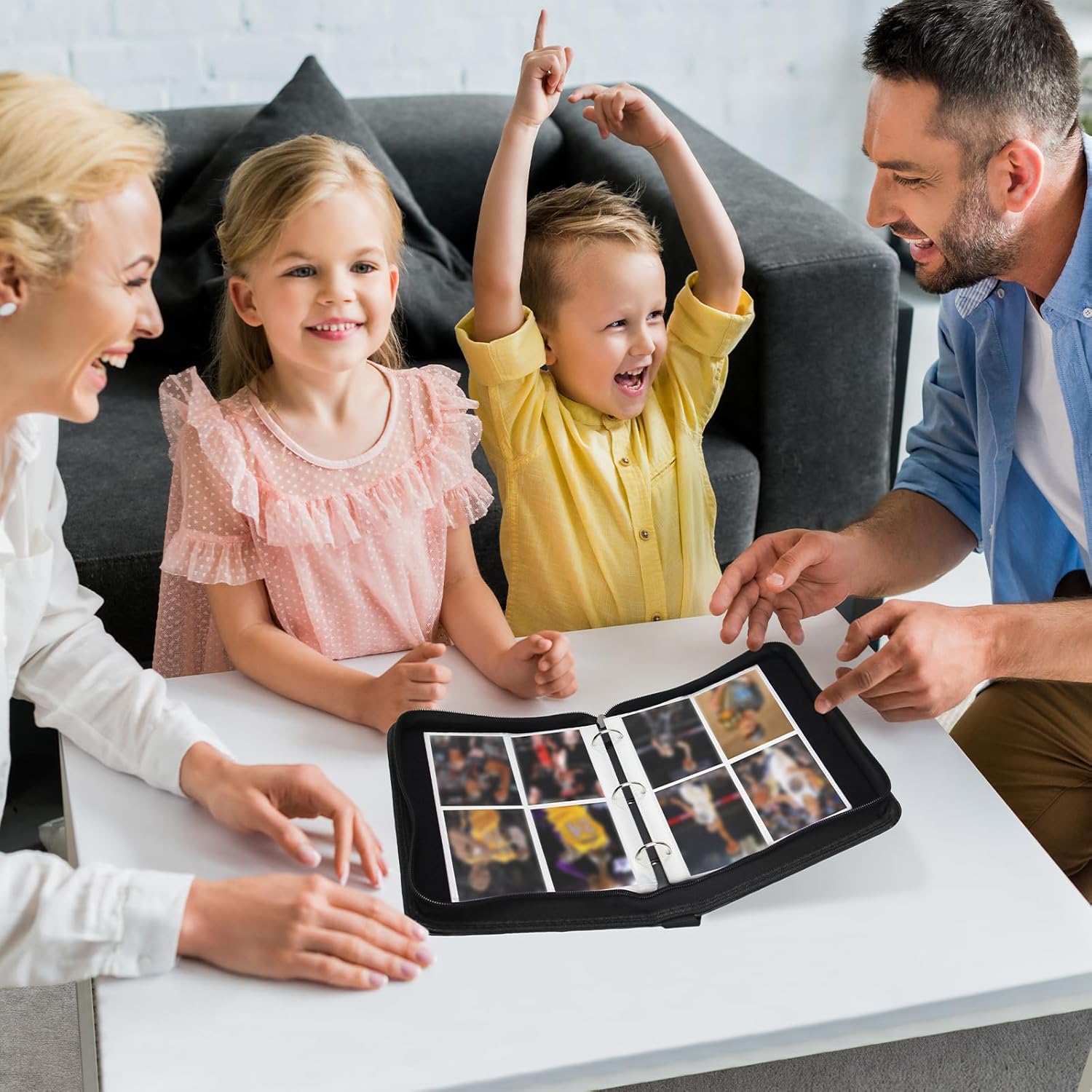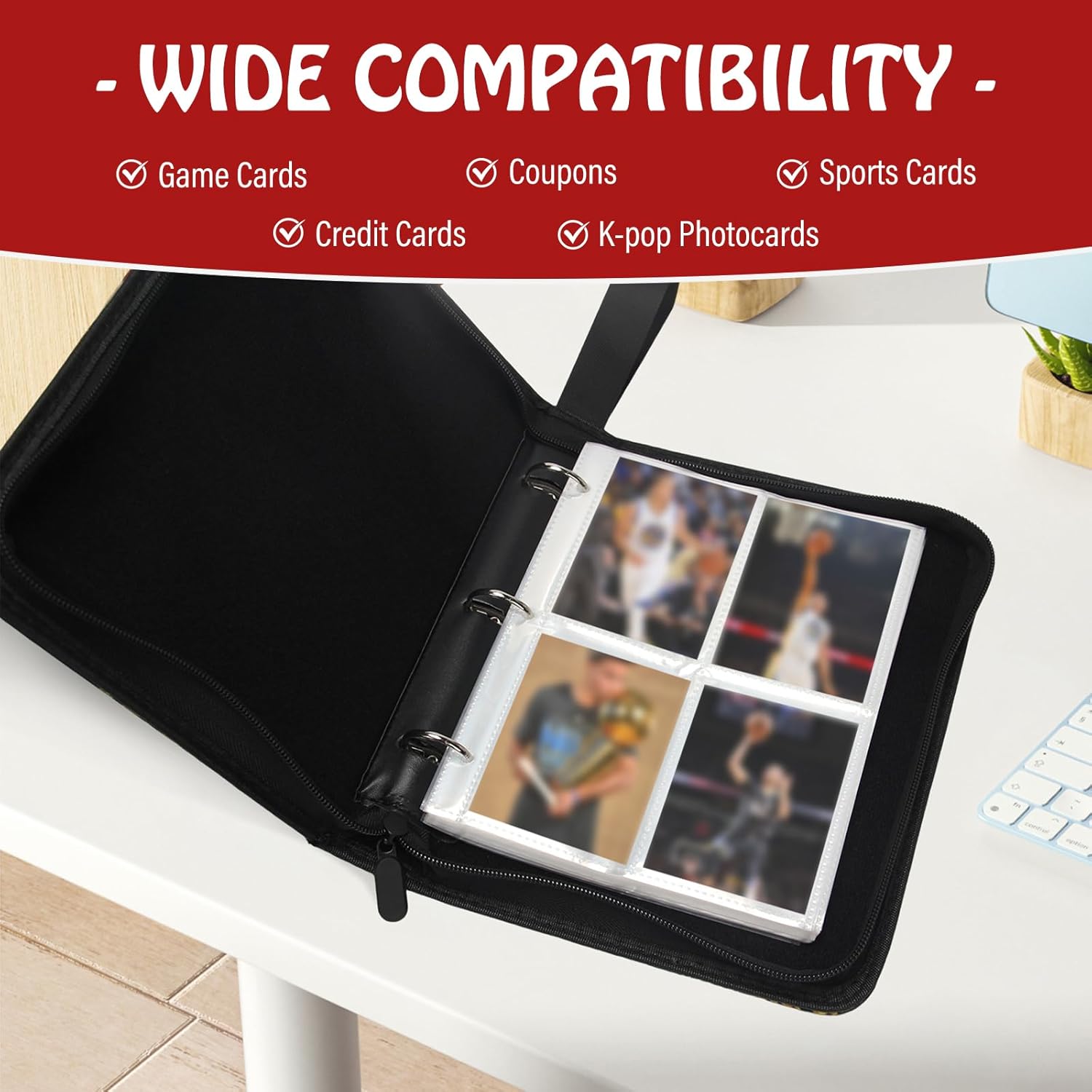 • Large Capacity Size: Inside page size: 2.68*3.5in,The card binder comes with 50 removable sleeves, which can hold up to 400 trading cards with 4 pockets on each side, allowing you to store cards on both the front and back.The trading card binder case is compatible with svarious standard-sized cards, Game Card , Football cards, Baseball cards