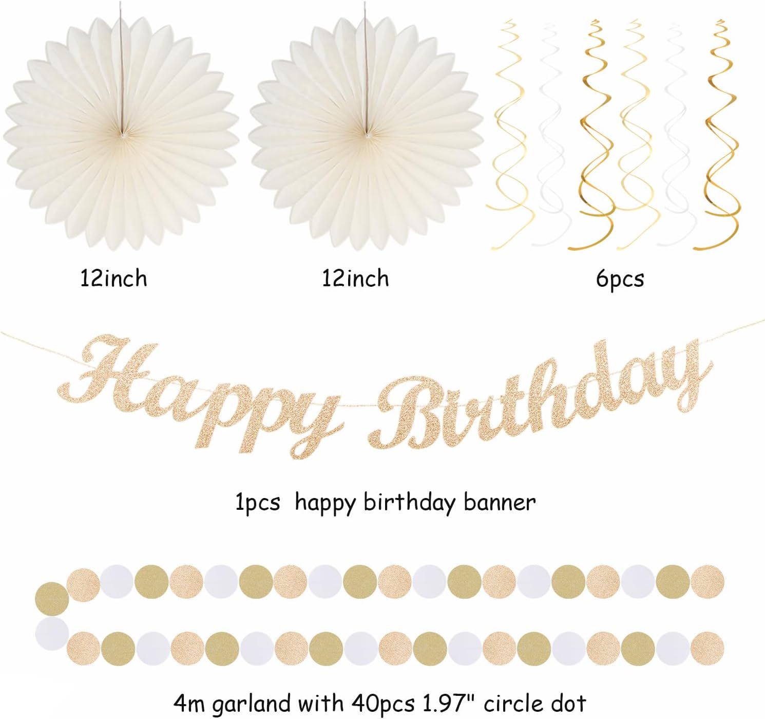 • Package Includes: This kits include 1pcs rose gold happy birthday banner, 1pcs circle dots paper banner, 10pcs tissue pom poms, 2pcs paper lanterns, 2pcs paper flower fans, 6pcs paper swirls hanging streamers in champagne beige and peach colors, and different sizes