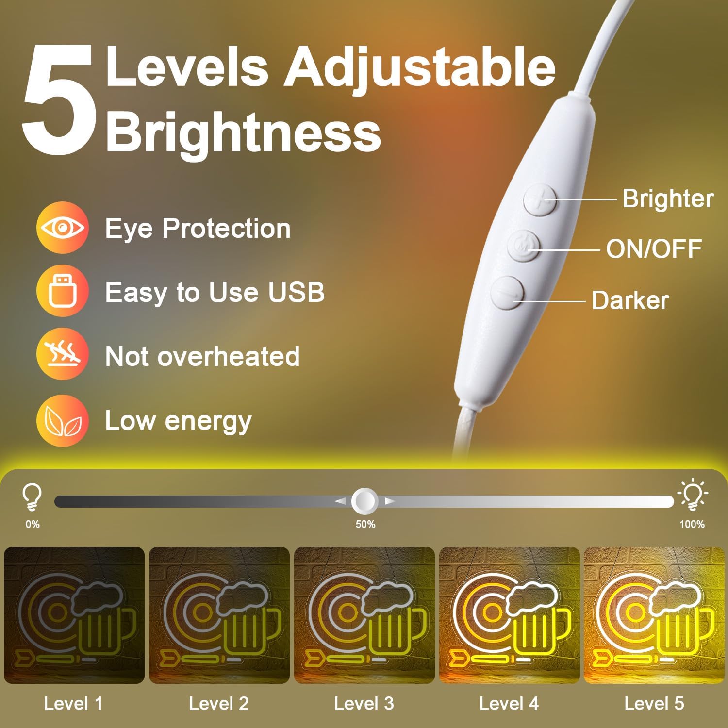 • 2. 💡【Vibrant LED Neon Sign – Brighter, Safer, Longer Lasting】 Unlike fragile glass neon, our LED neon wall sign is made with premium silicone LED tubes and durable acrylic backing, delivering ultra-bright glow without flicker or noise. It’s touch-safe, energy-efficient, and built to last. Add an eye-catching splash of yellow, orange and white to your space, creating the perfect ambiance for parties, chill nights, or watching the game with friends.