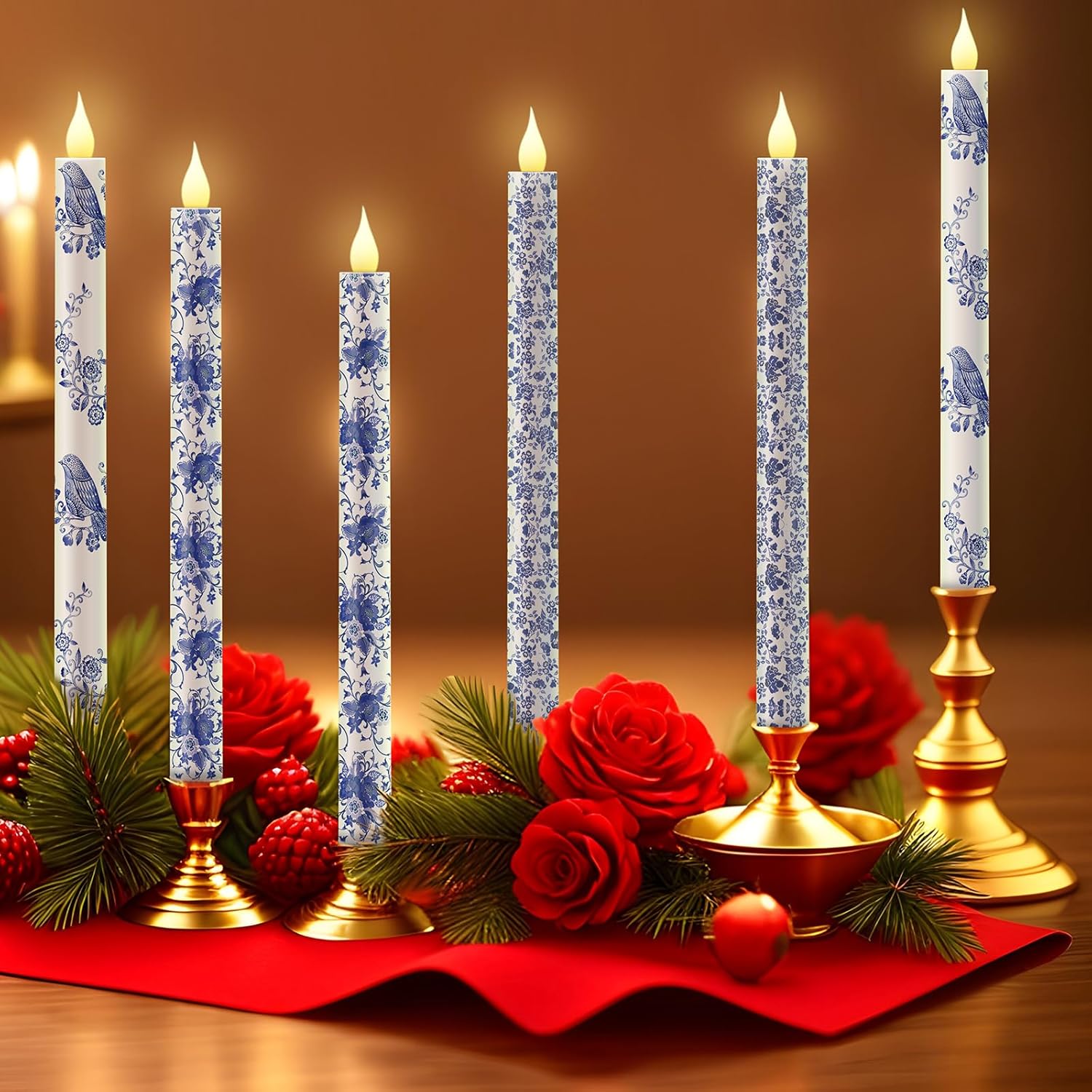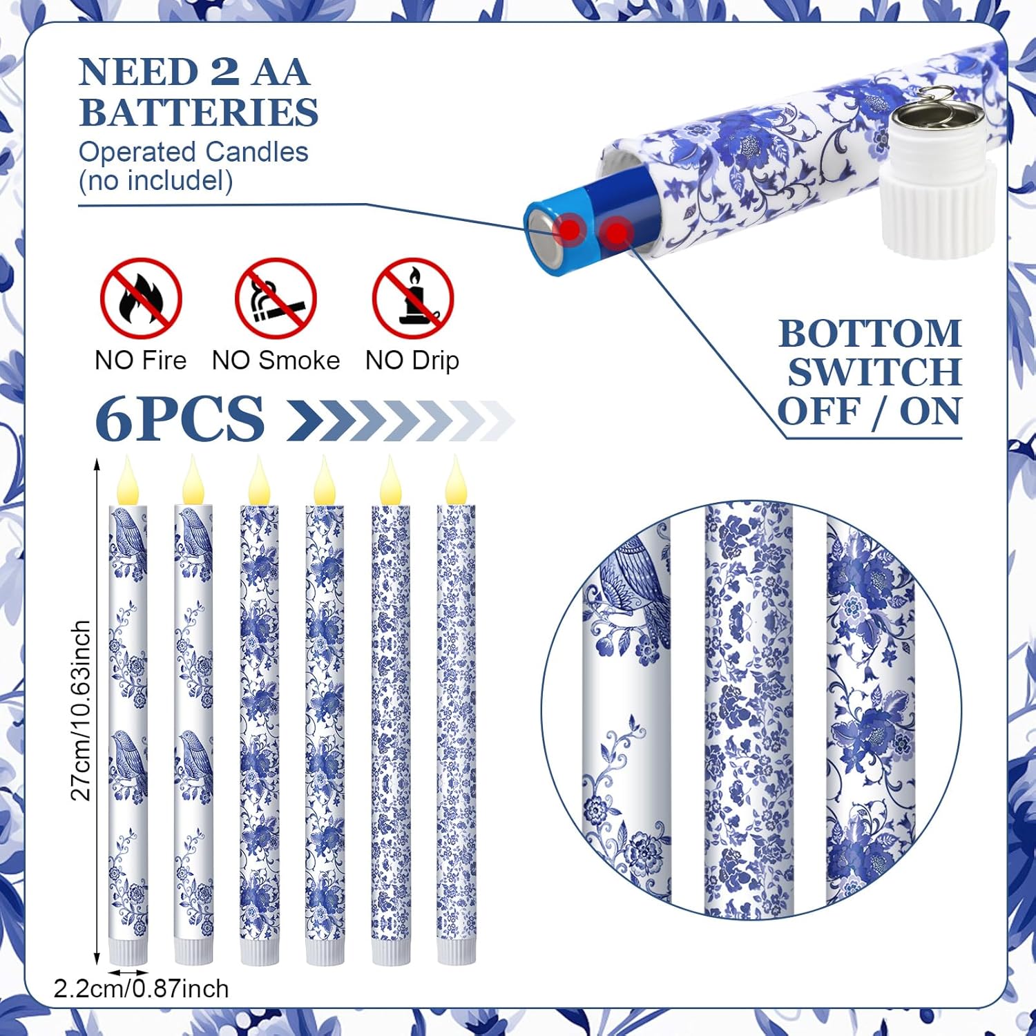 • Chinoiserie Bird Floral Design: our flameless taper candles feature 3D wick technology for a realistic flicker; The blue and white Chinoiserie floral birds design creates an elegant ambiance, making it ideal for enhancing the ambiance of your home or special events