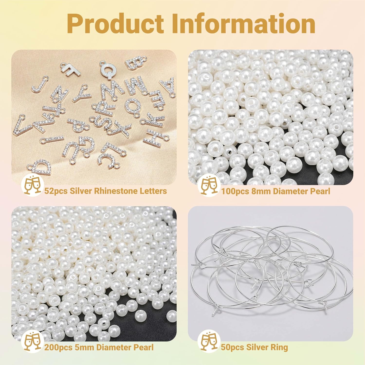 • DIY Wine Charms Kit: Includes 52 silver rhinestone letter beads + 50 silver-tone hoops, paired with 300 pearl pendants (approx. 200 pcs 0.2-inch + 100 pcs 0.3-inch) for sparkling brilliance. Spell names or initials to create personalized drinkware accessories