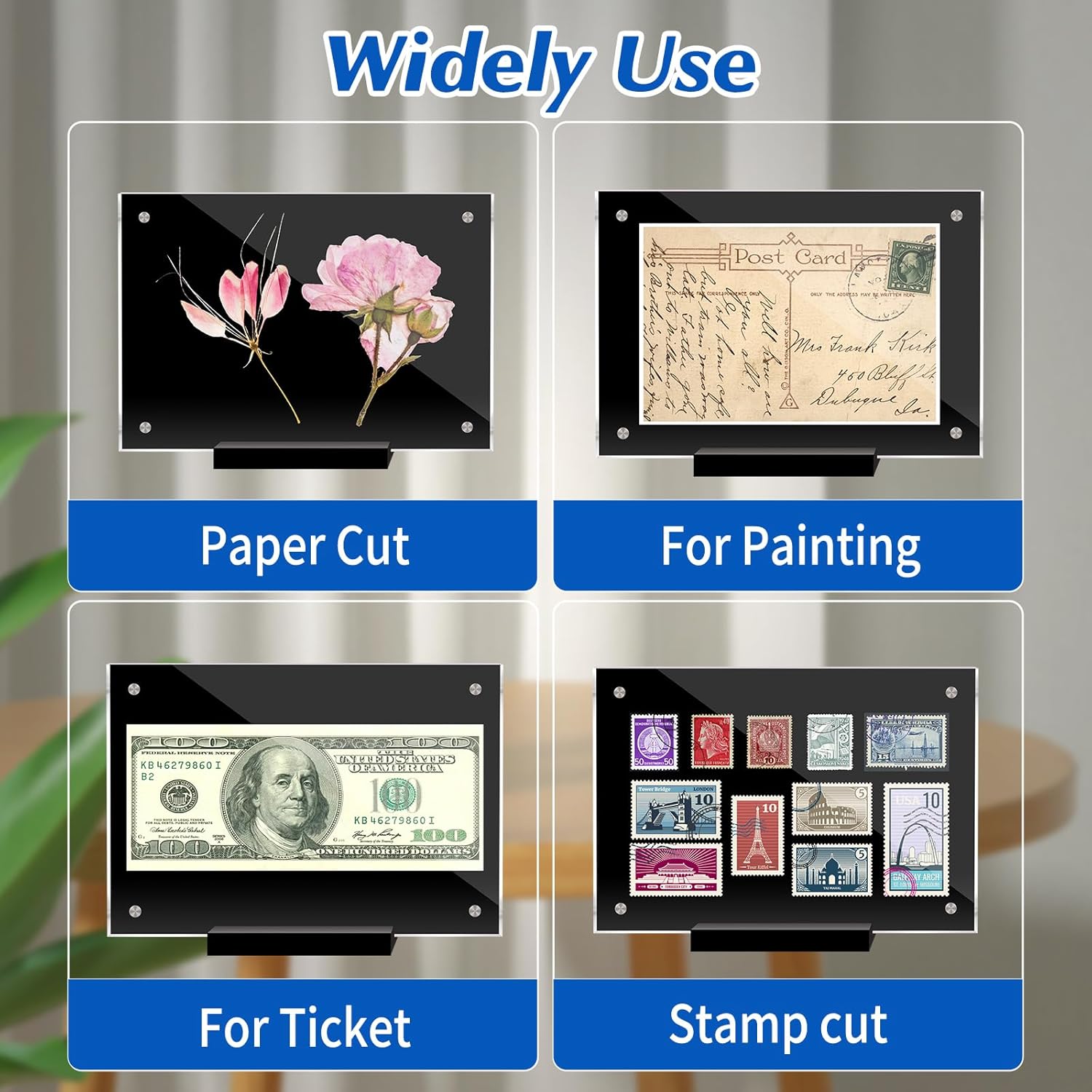 • Black Border Visual:With its unique two - acrylic panels design, the transparent front and black back combination gives your photos a professional, framed look. Especially suitable for displaying stamps, art paintings, precious tickets, Paper Cuttings, leaf specimens, postcards, etc