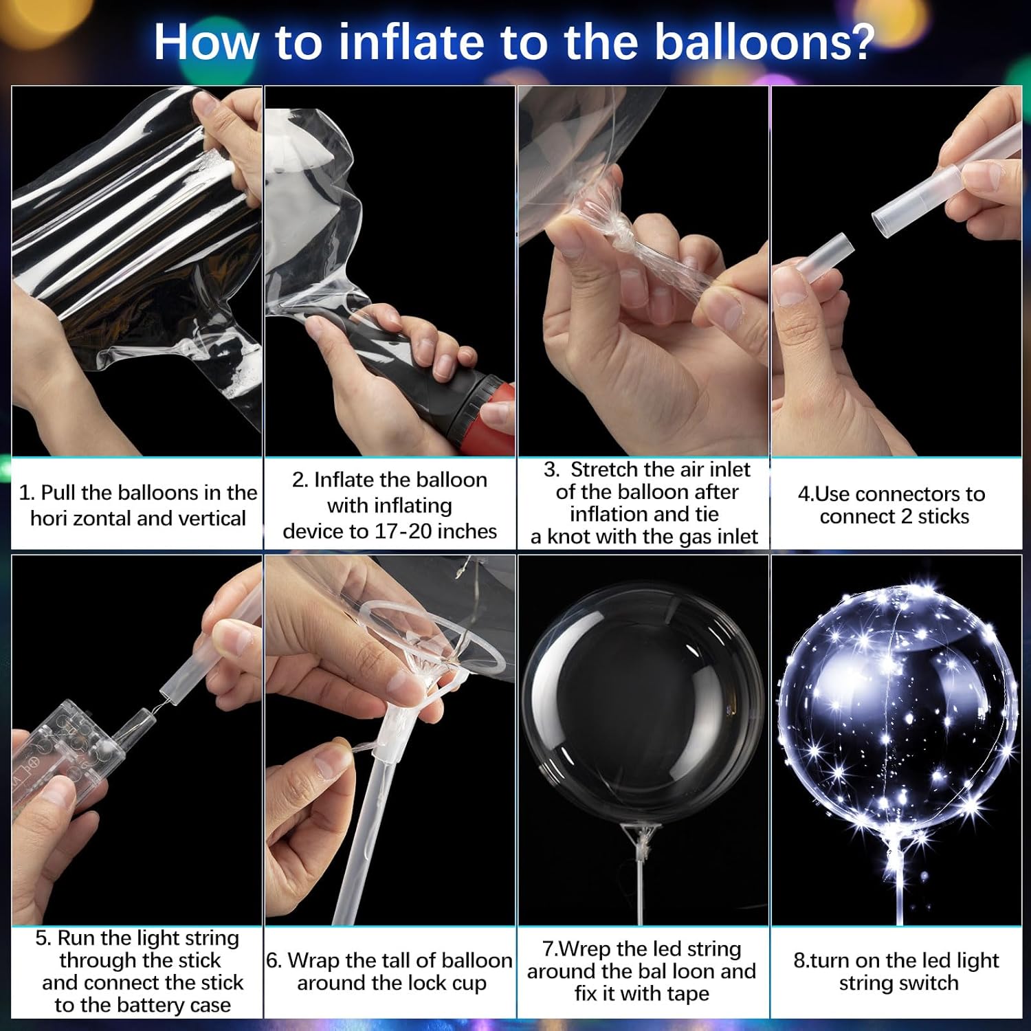 • Easy to Assemble: just fill these large balloons up with air or helium (do not inflate balloons with your mouth), string lights powered by 2 AA batteries (not included); The 8 inch balloon (deflated) can reach 20 inch when inflated; Please follow the picture tutorials on the detail page