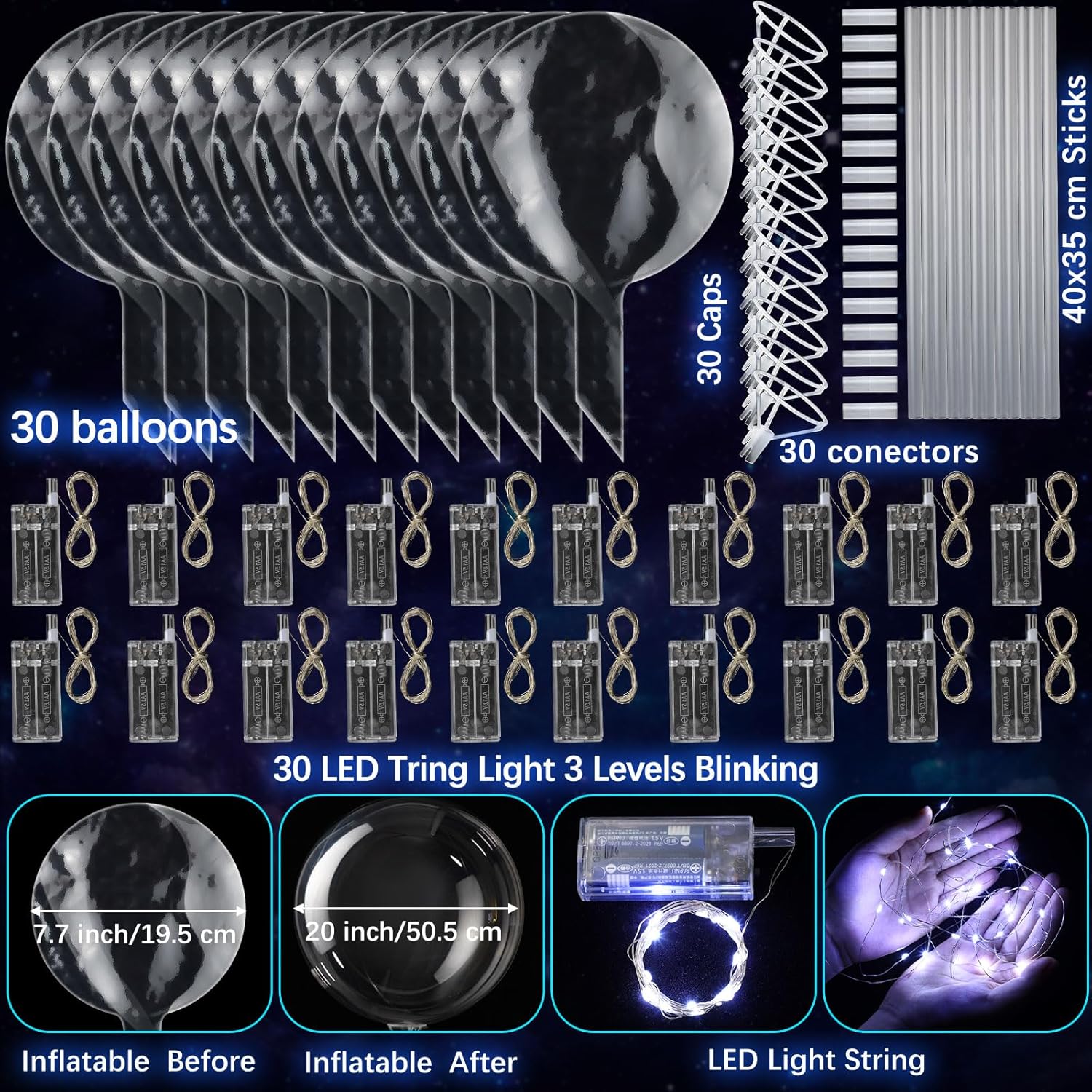 • Included Components : 30 x Bobo balloons, 30 x Connector, 30 x LED strings light with battery box, 60 x Sticks