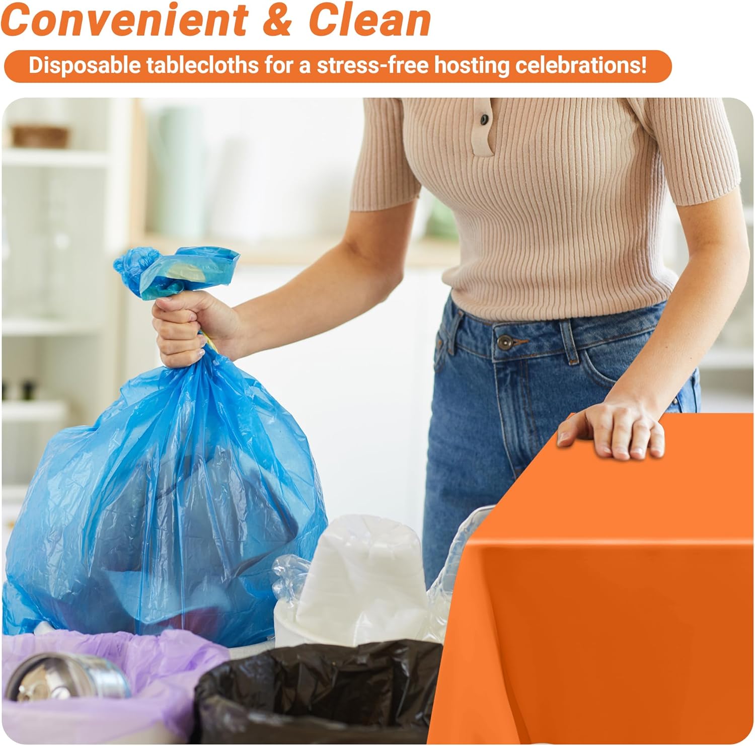 • Quick and Easy Cleanup: These orange plastic tablecloths effortlessly handle spills from meals, beverages or art supplies. Simply dispose of them after use for hassle-free cleanup!