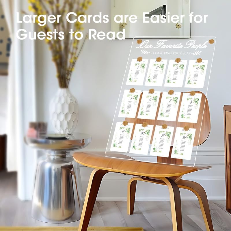 • Usage: ① Use with seat cards (not included) displayed on easels or tables; ② Hang on a sign display stand via the pre-drilled holes for enhanced visibility. If holes are undesirable, cover them with included eucalyptus sealant stickers or decorate with floral arrangements