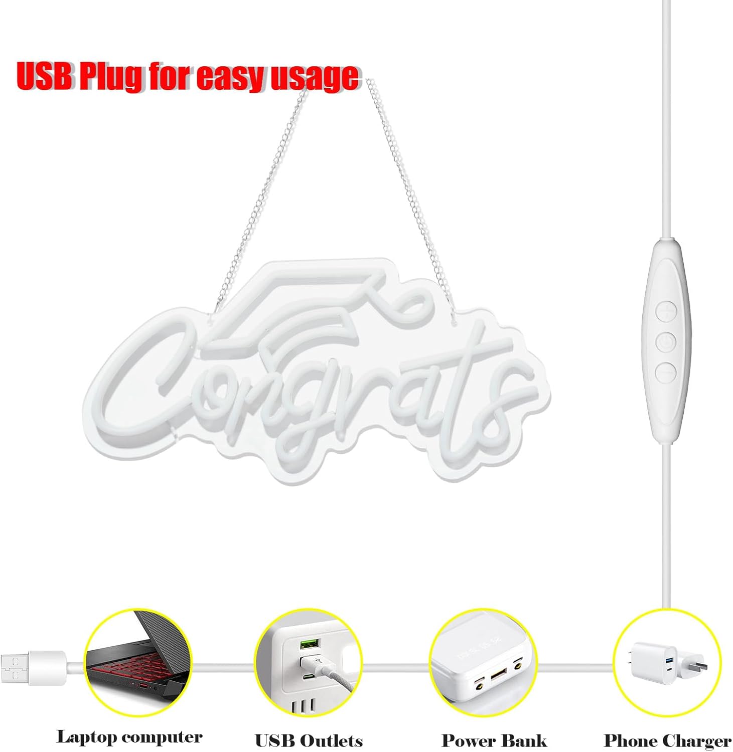 • Easy to Use:Simply mount this congrats neon sign on the wall .Plug it into a power supply, computer interface or power bank to light up.The neon sign features a dimmer switch, allowing you to adjust the brightness to suit your preferences and create the perfect ambiance for any occasion.You can place it anywhere you want to decorate it and just hang it. enjoy the warm glow and cheerful aesthetic it brings to neon sign.