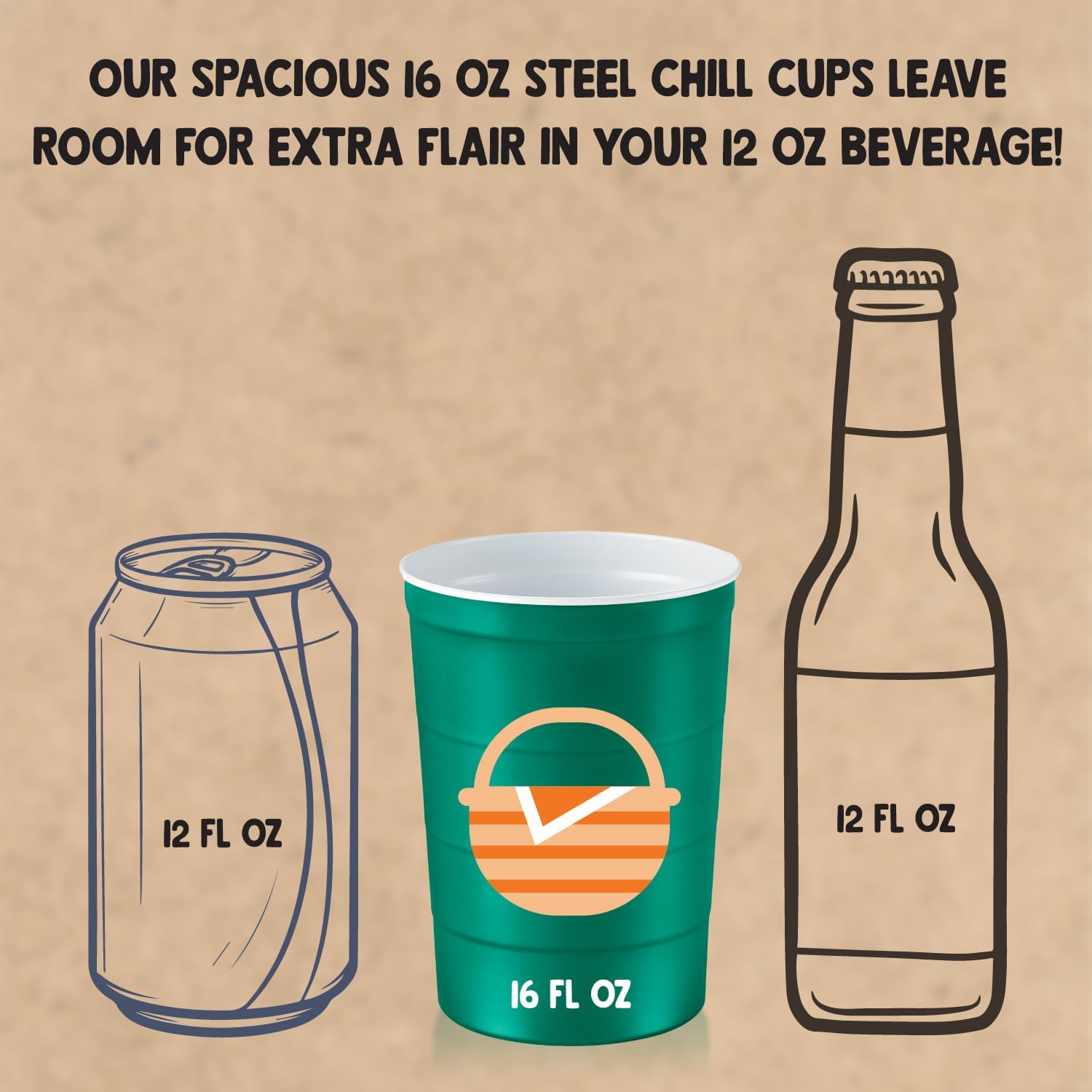 • Earth-Friendly Drinkware: Unlike plastic party cups that end up in landfills, sustainable celebratory Steel Chill Cups are 100% recyclable; reuse hand-washable cups for your party event