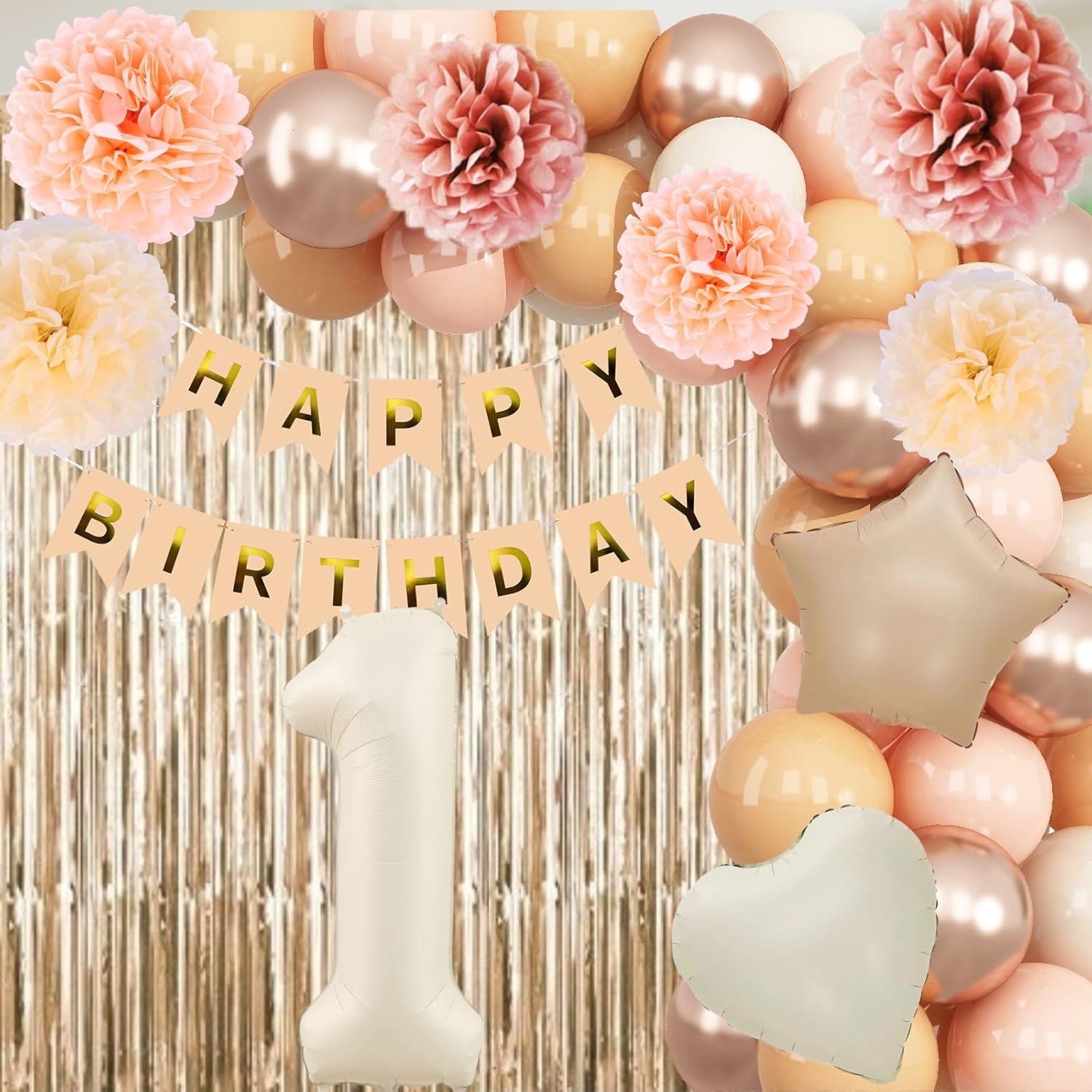 • PACKAGE INCLUDES: 1pc beige 1 number balloon, 1pc happy birthday banner, 2pcs dusty pink paper pom poms, 2pcs blush paper pom poms, 2pcs nude paper pom poms, 1pc champagne gold fringe curtain, 1pc caramel star foil balloons, 1pc cream heart foil balloons, 8pcs nude balloons, 6pcs blush balloons, 8pcs beige balloons, 4pcs champagne gold balloons, 1pc ribbon