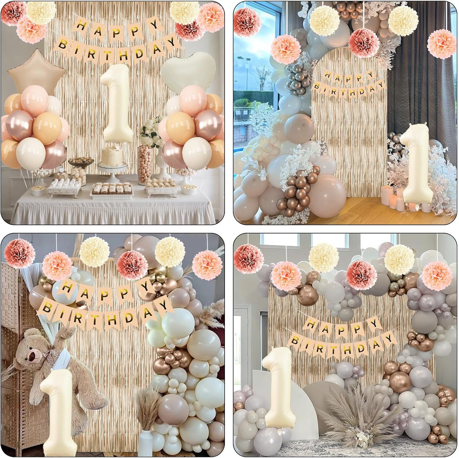 Beige 1st Birthday Decorations Cream Number 1 Balloon Nude Gold Happy Birthday Banner Fringe Curtain Paper Pom Poms Blush White Sand Champagne Star Foil Balloons Neutral Boho Party Decor