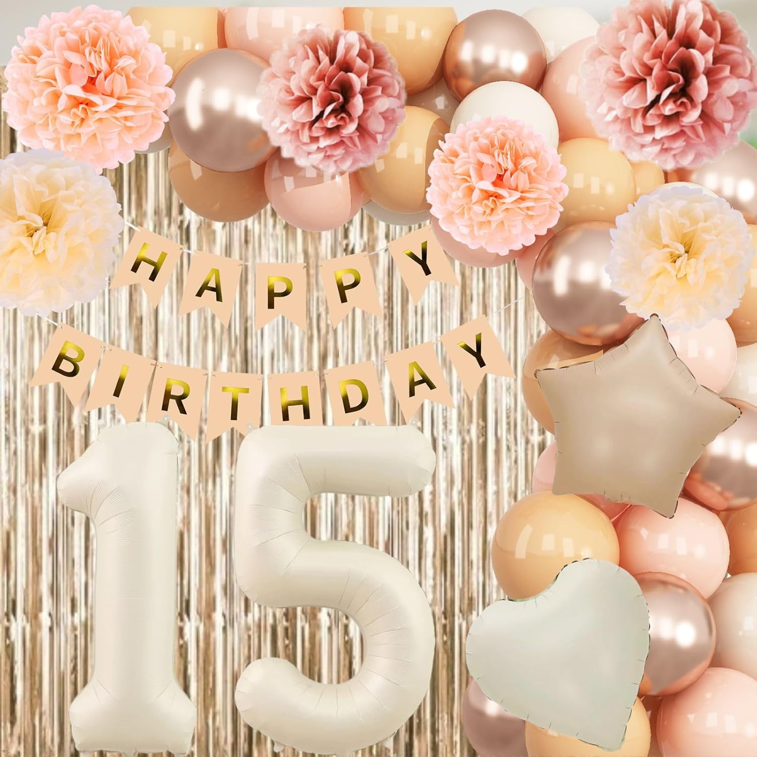 • ALL-IN-ONE DECORATION: Comes with a “15” foil number balloon, includes everything you need: birthday banner, fringe curtain, blush cream gold balloons, star foil balloons, paper pom poms, and ribbon, ideal for 15 year old birthdays for girls, 15th birthday party, photo shoots, and family gatherings, suits both indoor and outdoor setups