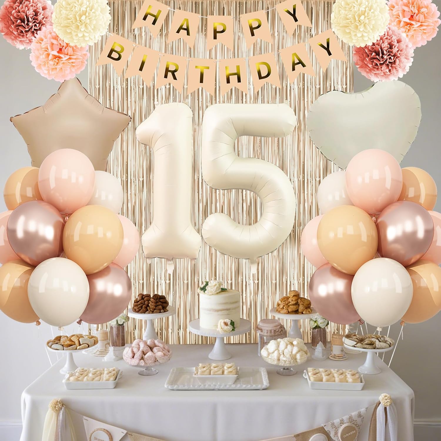 • BEIGE CREAM BIRTHDAY DECORATIONS: Features a soft and stylish color palette of nude, blush, beige, caramel, and champagne gold, great for creating a warm, minimalist birthday setup with a modern, boho vibe, celebrate 15th birthday in style with the included beige “15” number foil balloon