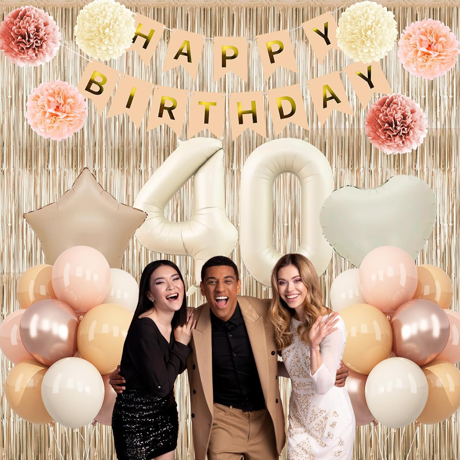 • PACKAGE INCLUDES: 1pc beige 40 number balloon, 1pc happy birthday banner, 2pcs dusty pink paper pom poms, 2pcs blush paper pom poms, 2pcs nude paper pom poms, 1pc champagne gold fringe curtain, 1pc caramel star foil balloons, 1pc cream heart foil balloons, 8pcs nude balloons, 6pcs blush balloons, 8pcs beige balloons, 4pcs champagne gold balloons, 1pc ribbon