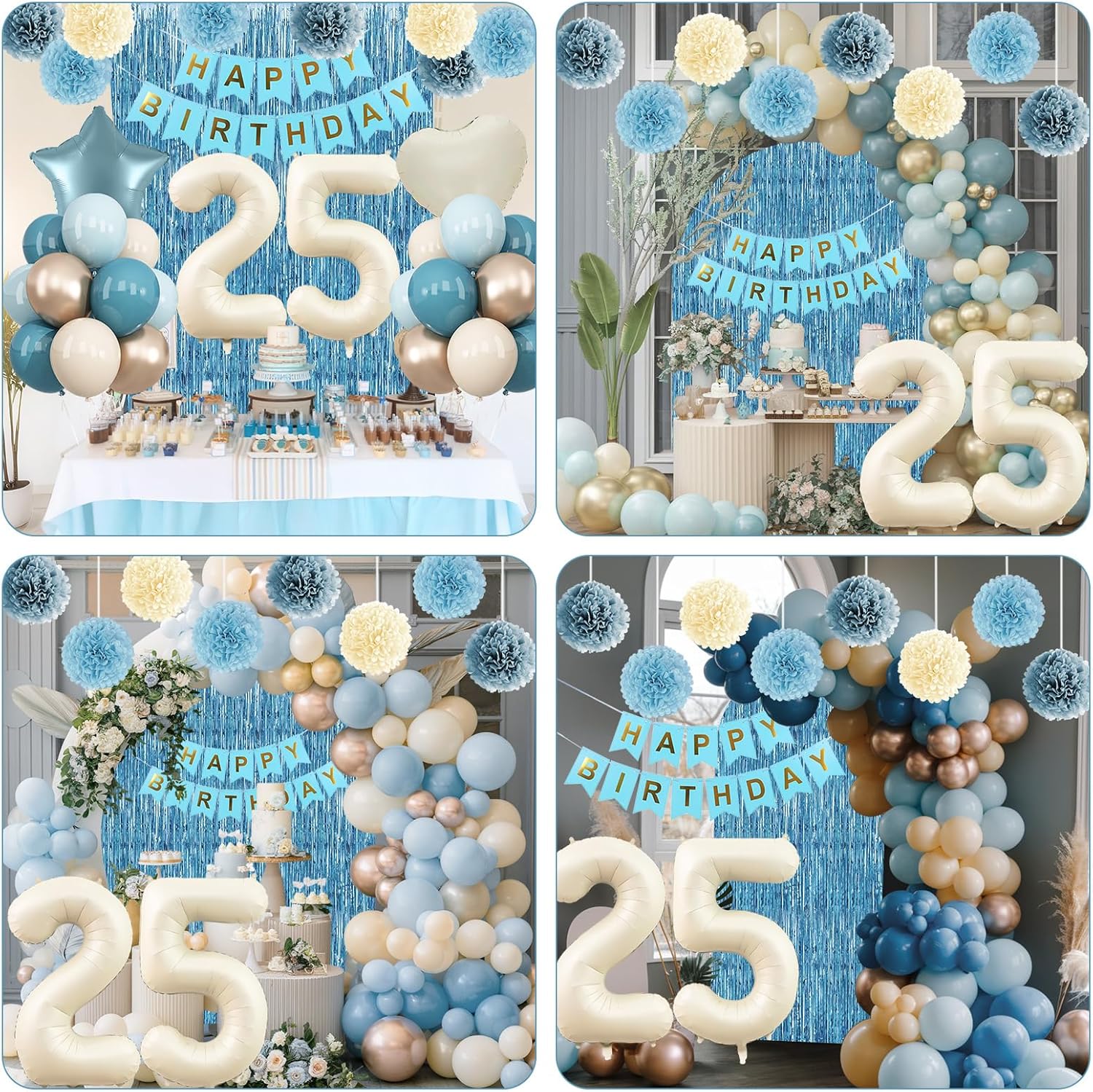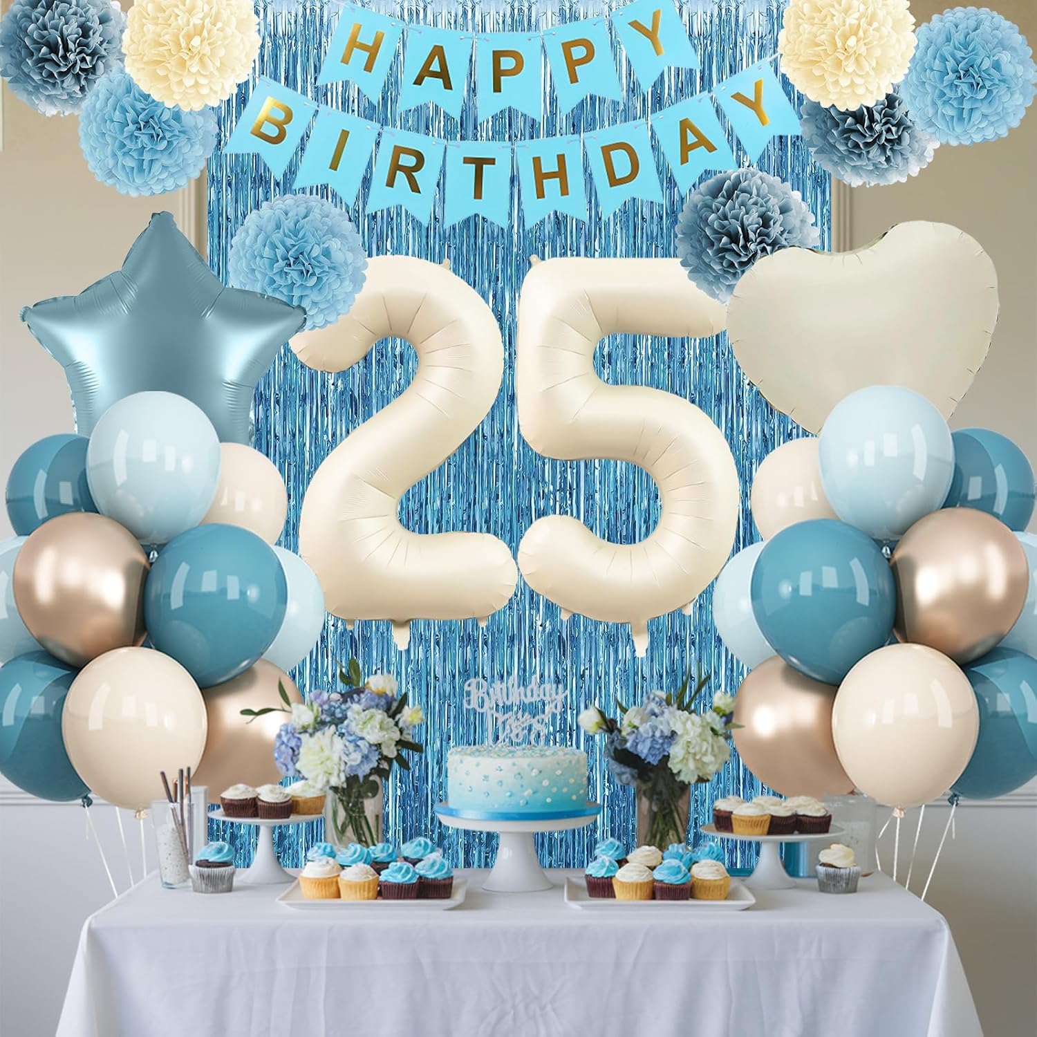 • PACKAGE INCLUDES: 1pc 25 number balloon, 1pc happy birthday banner, 3pcs light blue paper Pom Poms, 3pcs dusty blue paper pom poms, 3pcs nude paper pom poms, 1pc blue fringe curtain, 2pcs dusty blue star foil balloons, 8pcs dusty blue balloons, 7pcs fog blue balloons, 7pcs beige balloons, 4pcs champagne gold balloons, 1pc ribbon