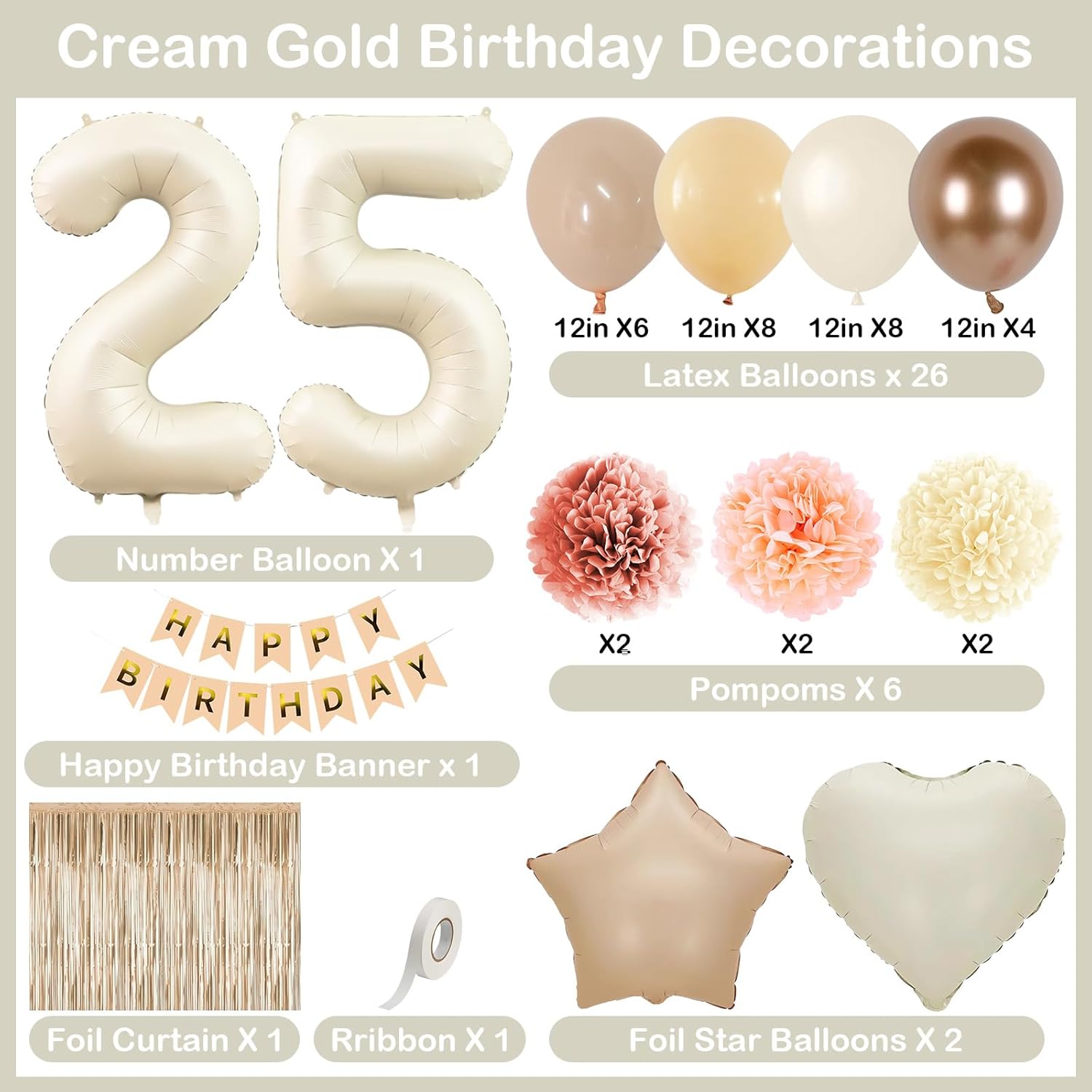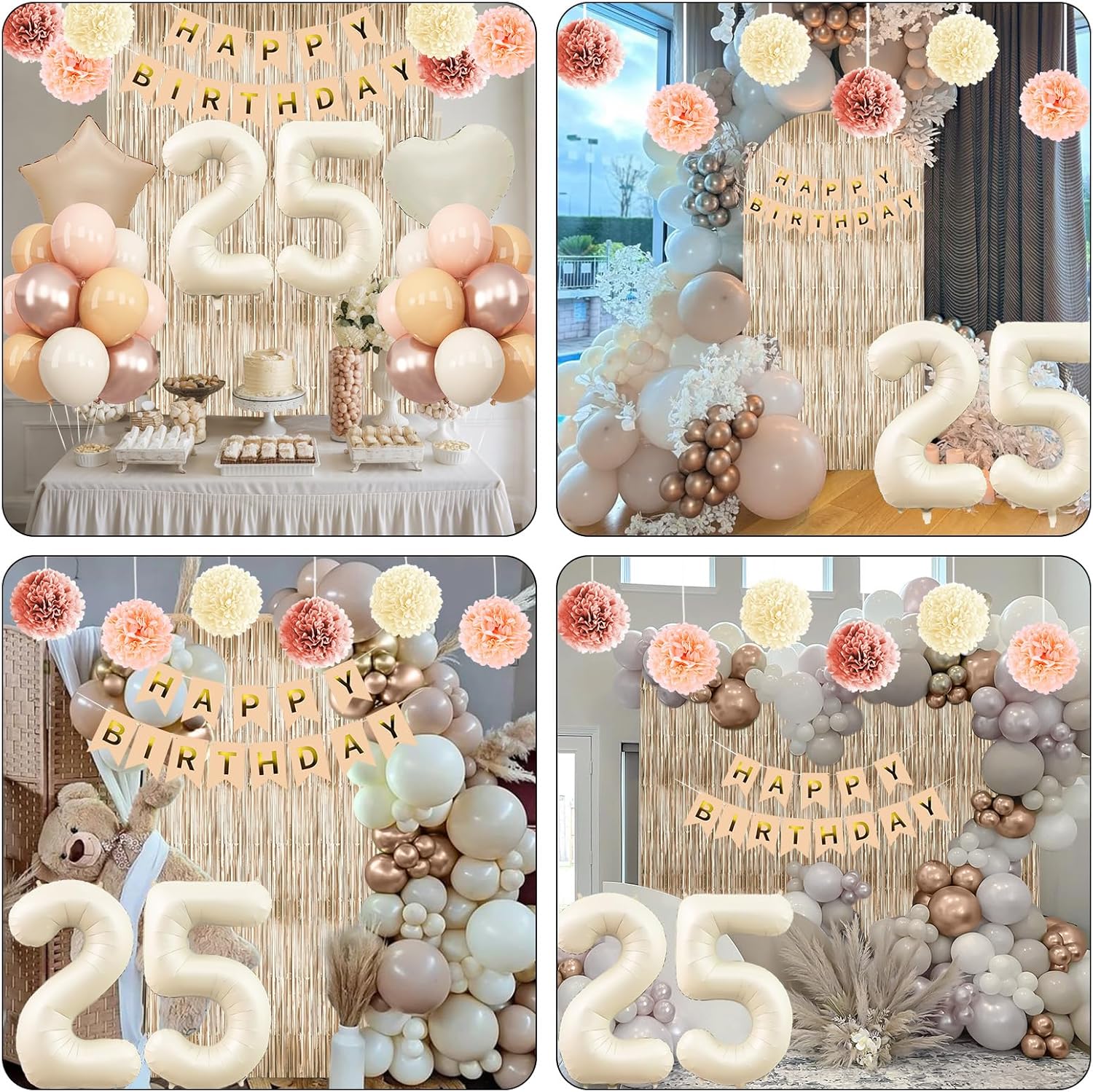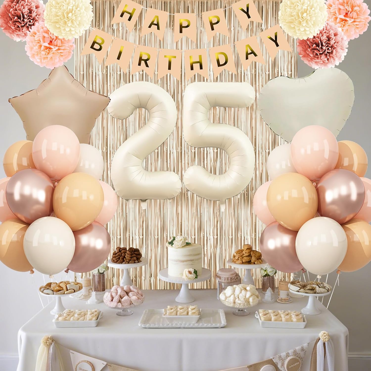 • BEIGE CREAM BIRTHDAY DECORATIONS: Features a soft and stylish color palette of nude, blush, beige, caramel, and champagne gold, great for creating a warm, minimalist birthday setup with a modern, boho vibe, celebrate 25th birthday in style with the included beige “25” number foil balloon