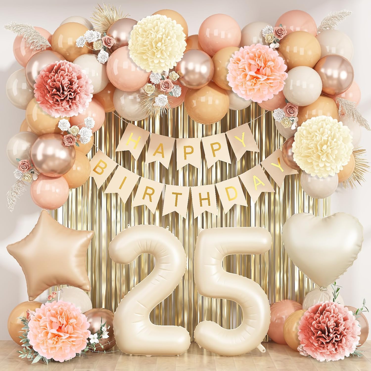 • ALL-IN-ONE DECORATION: Comes with a “25” foil number balloon, includes everything you need: birthday banner, fringe curtain, blush cream gold balloons, star foil balloons, paper pom poms, and ribbon, ideal for 25 year old birthdays for her, 25th birthday party, photo shoots, and family gatherings, suits both indoor and outdoor setups