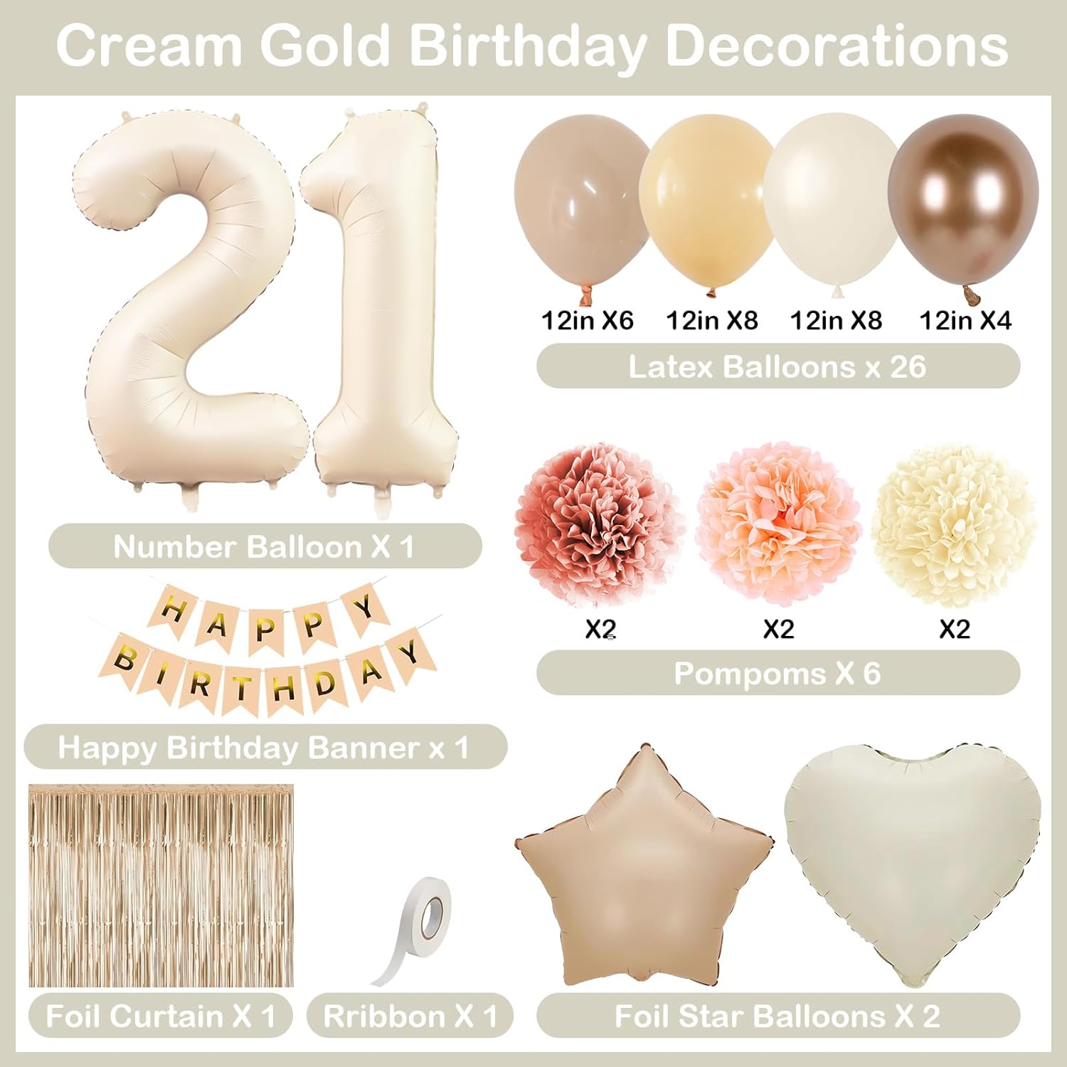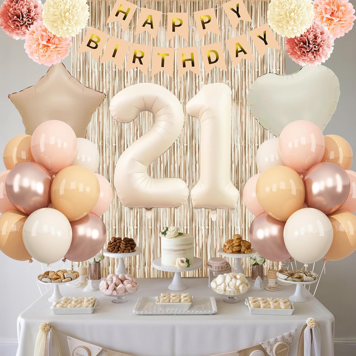 • PACKAGE INCLUDES: 1pc beige 21 number balloon, 1pc happy birthday banner, 2pcs dusty pink paper pom poms, 2pcs blush paper pom poms, 2pcs nude paper pom poms, 1pc champagne gold fringe curtain, 1pc caramel star foil balloons, 1pc cream heart foil balloons, 8pcs nude balloons, 6pcs blush balloons, 8pcs beige balloons, 4pcs champagne gold balloons, 1pc ribbon