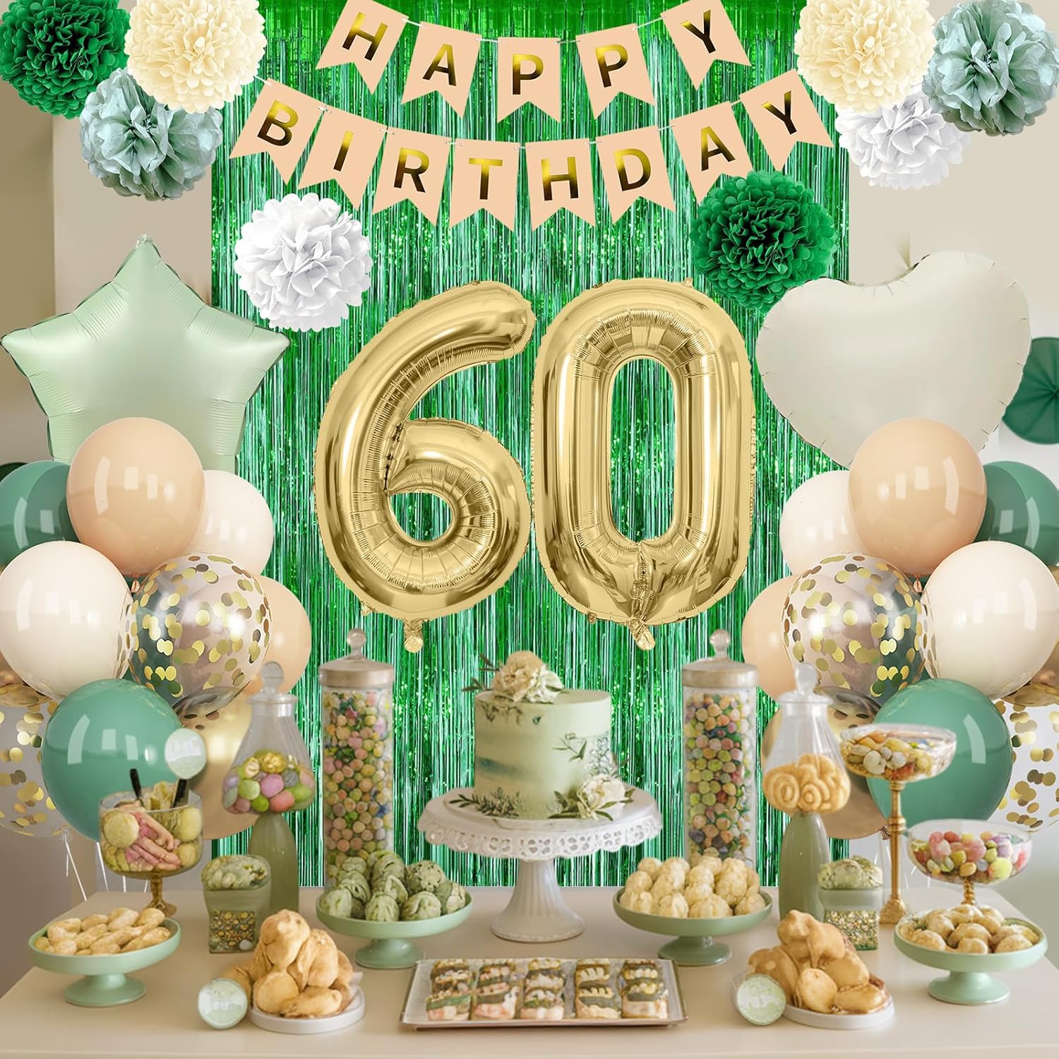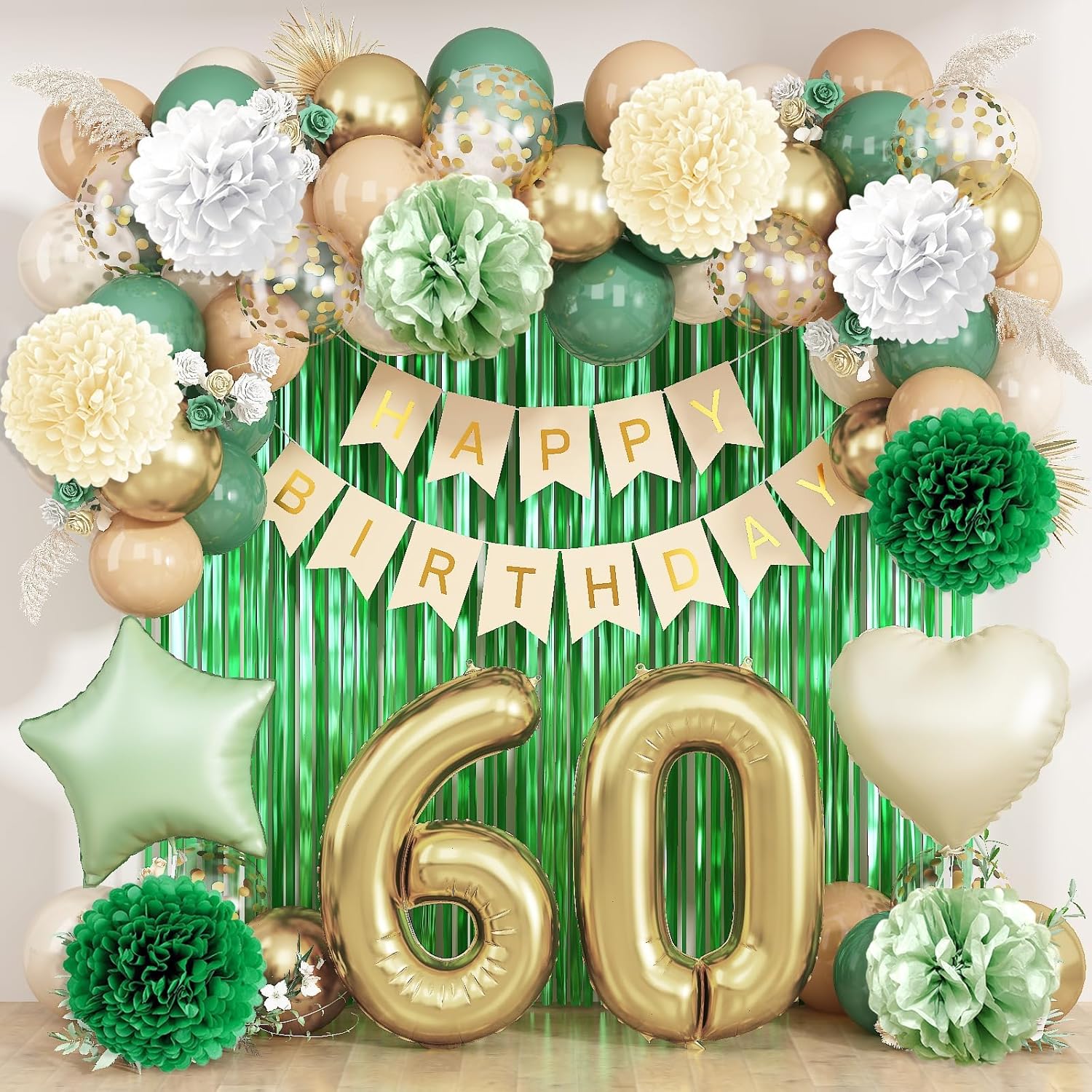 • PACKAGE INCLUDES: 1pc gold 60 number balloon, 1pc happy birthday banner, 2pcs deep green paper pom poms, 2pcs sage green paper pom poms, 2pcs nude paper pom poms, 2pcs white paper pom poms, 1pc green fringe curtain, 1pc olive green star foil balloons, 1pc cream heart foil balloons, 6pcs nude balloons, 6pcs sage green balloons, 6pcs beige balloons, 4pcs metallic gold balloons, 4pcs gold confetti balloons, 1pc ribbon