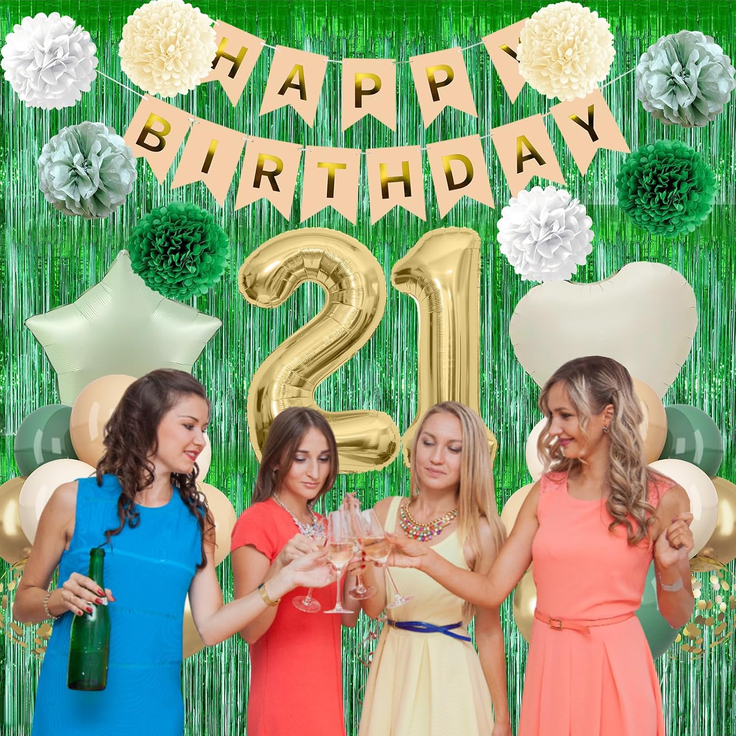 • PACKAGE INCLUDES: 1pc gold 21 number balloon, 1pc happy birthday banner, 2pcs deep green paper pom poms, 2pcs sage green paper pom poms, 2pcs nude paper pom poms, 2pcs white paper pom poms, 1pc green fringe curtain, 1pc olive green star foil balloons, 1pc cream heart foil balloons, 6pcs nude balloons, 6pcs sage green balloons, 6pcs beige balloons, 4pcs metallic gold balloons, 4pcs gold confetti balloons, 1pc ribbon