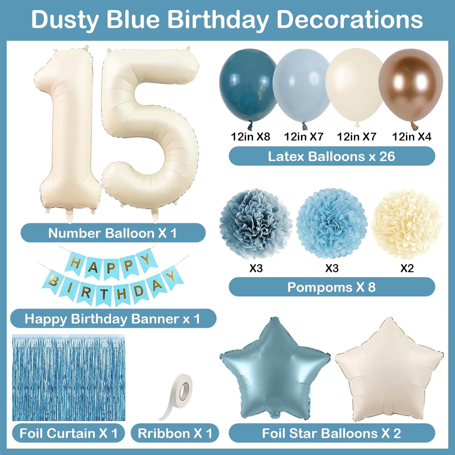 • PACKAGE INCLUDES: 1pc 15 number balloon, 1pc happy birthday banner, 3pcs light blue paper Pom Poms, 3pcs dusty blue paper pom poms, 3pcs nude paper pom poms, 1pc blue fringe curtain, 2pcs dusty blue star foil balloons, 8pcs dusty blue balloons, 7pcs fog blue balloons, 7pcs beige balloons, 4pcs champagne gold balloons, 1pc ribbon