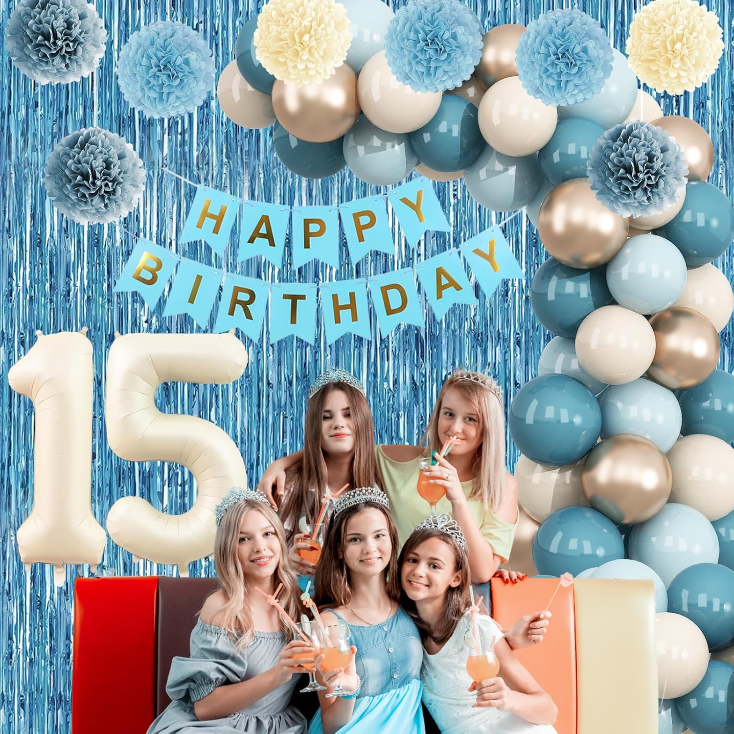 • ALL-IN-ONE DECORATION: Comes with a “15” foil number balloon, includes everything you need: birthday banner, fringe curtain, blue beige gold balloons, star foil balloons, paper pom poms, and ribbon, ideal for 15 year old birthdays, 15th birthday party, photo shoots, and family gatherings, suits both indoor and outdoor setups