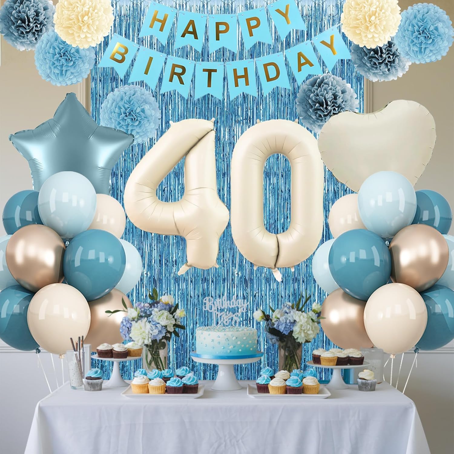 • PACKAGE INCLUDES: 1pc 40 number balloon, 1pc happy birthday banner, 3pcs light blue paper Pom Poms, 3pcs dusty blue paper pom poms, 3pcs nude paper pom poms, 1pc blue fringe curtain, 2pcs dusty blue star foil balloons, 8pcs dusty blue balloons, 7pcs fog blue balloons, 7pcs beige balloons, 4pcs champagne gold balloons, 1pc ribbon