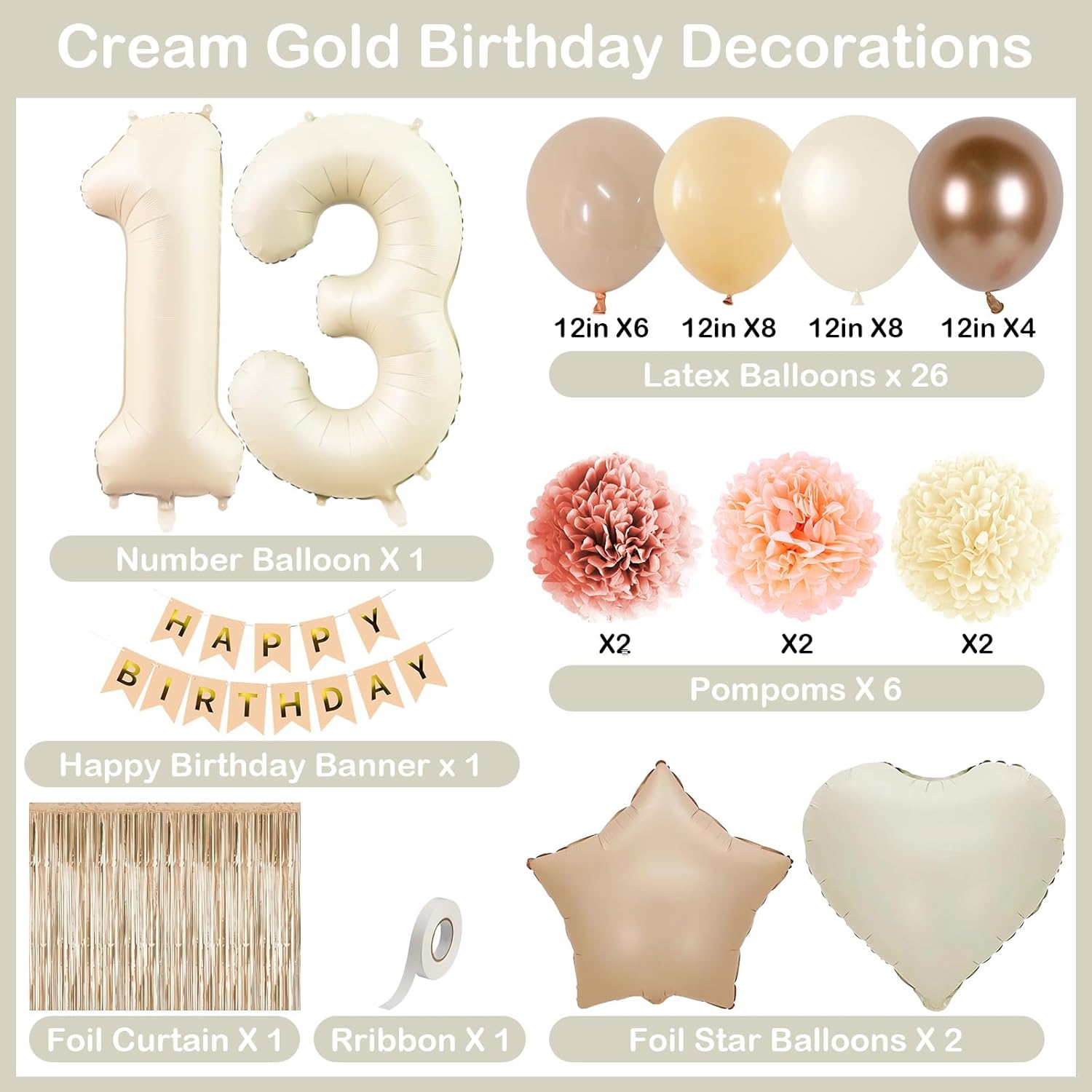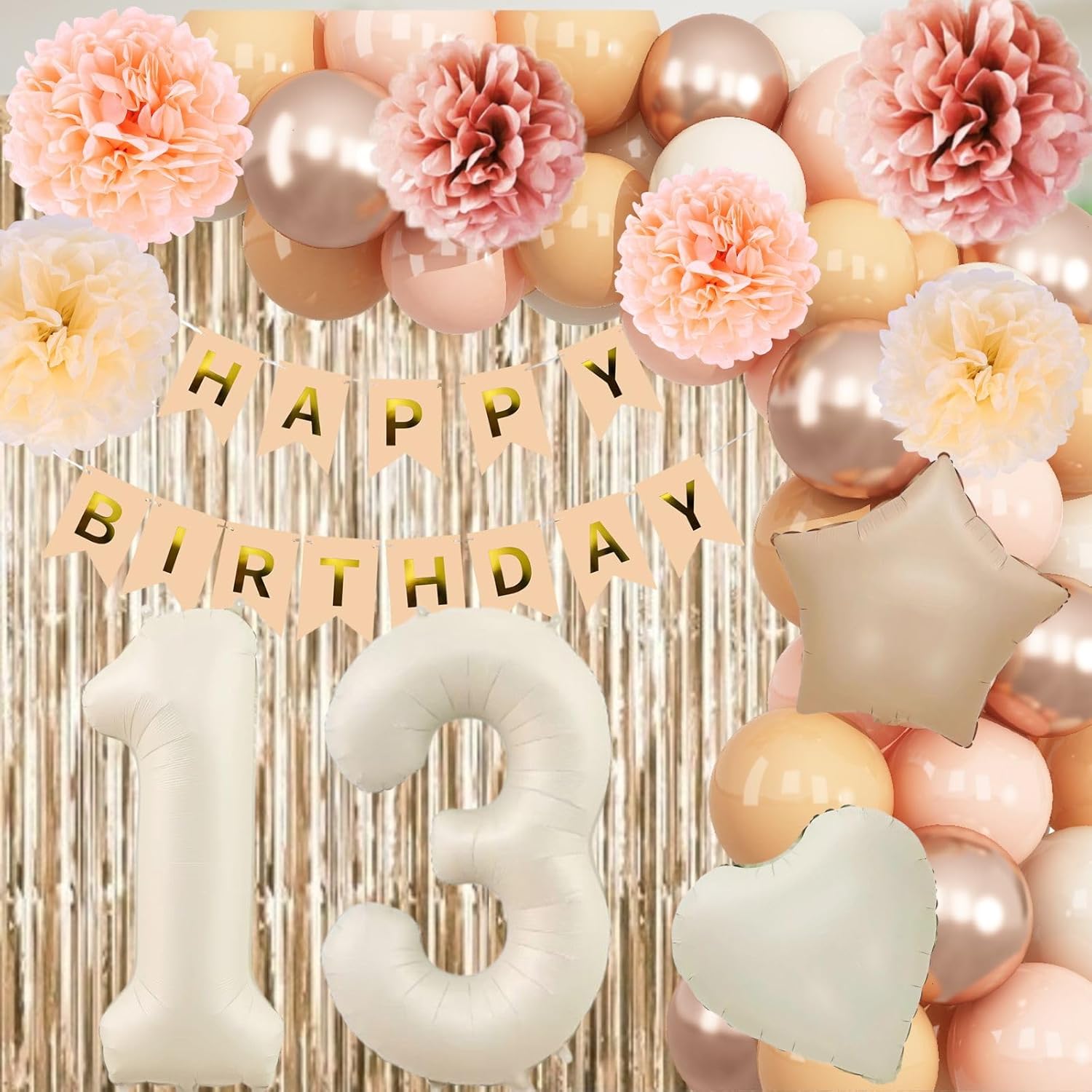 • PACKAGE INCLUDES: 1pc beige 13 number balloon, 1pc happy birthday banner, 2pcs dusty pink paper pom poms, 2pcs blush paper pom poms, 2pcs nude paper pom poms, 1pc champagne gold fringe curtain, 1pc caramel star foil balloons, 1pc cream heart foil balloons, 8pcs nude balloons, 6pcs blush balloons, 8pcs beige balloons, 4pcs champagne gold balloons, 1pc ribbon