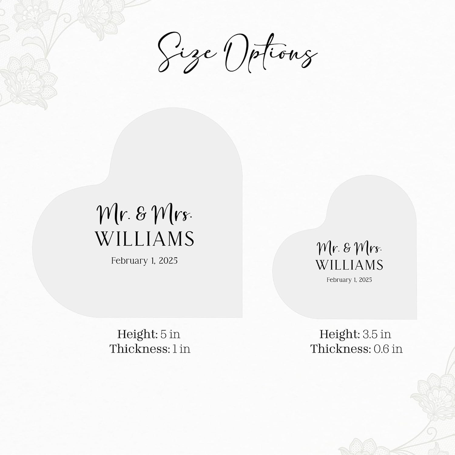 • 2 Size Options: Available in two sizes—Large (5" height, 1" thickness) and Small (3.5" height, 0.6" thickness)—this cake topper is designed to suit any wedding or engagement ceremony.