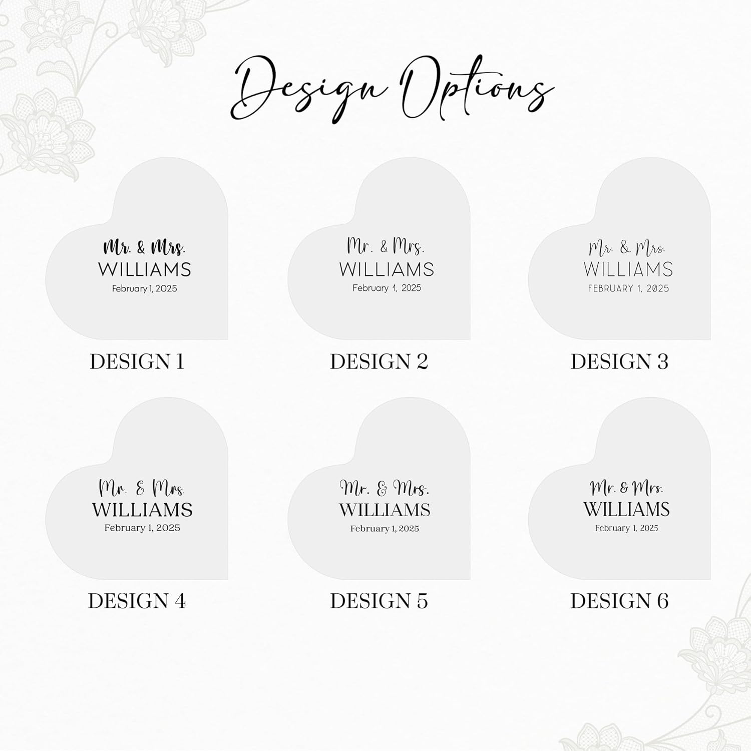 • Personalized Cake Topper: Add a unique touch to your wedding day by customizing this heart-shaped acrylic block with the bride and groom’s names. Choose from 6 elegant designs and 7 colors to perfectly match your wedding theme and style.