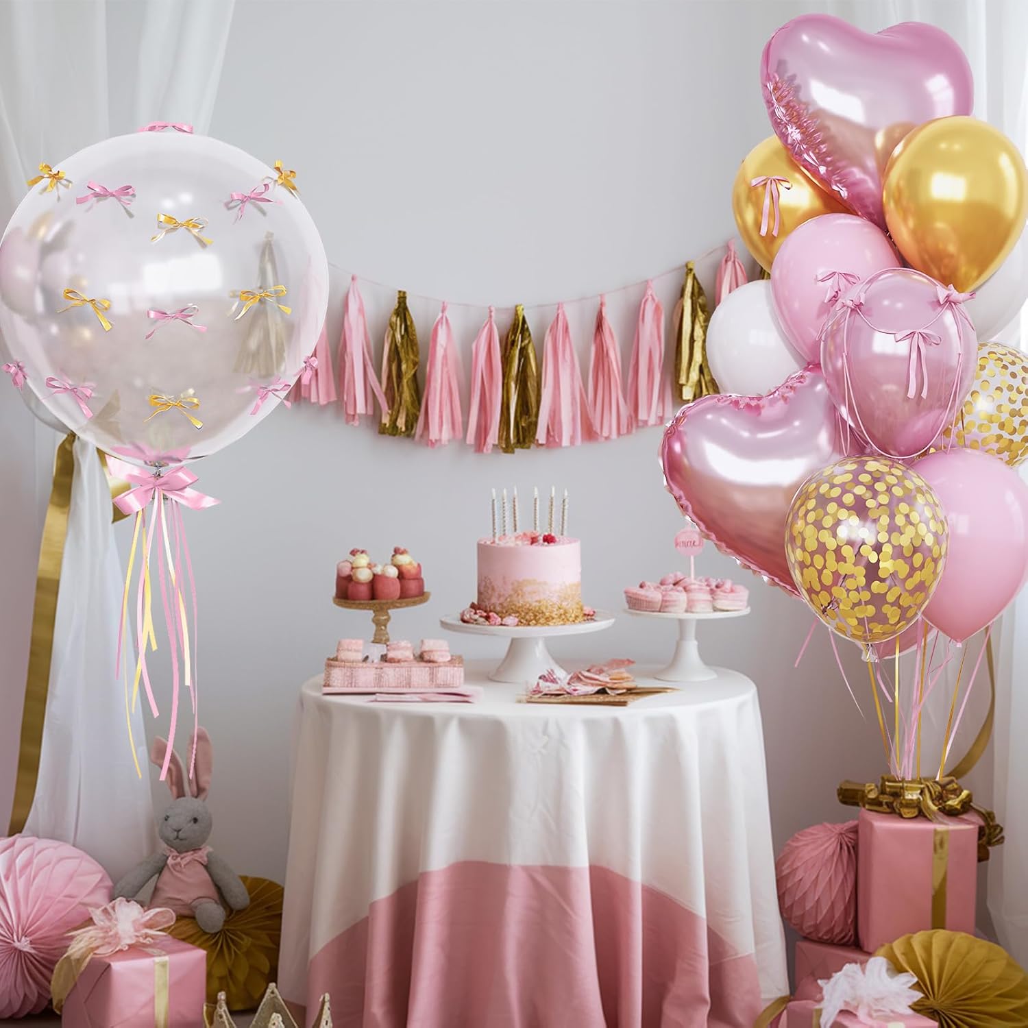 • 🥳【Pink Gold Heart Balloon Set - Exquisite Party Decoration】: Pink Heart-Shaped Foil Balloons (18-in x 4), Transparent Balloon (18-in x 1), Metallic Gold Balloons (12-in x 4), Macaron Pink Balloons (12-in x 4), Gold Confetti Balloons (12-in x 4), Pearl Light Pink Balloons (12-in x 4), White Balloons (12-in x 4), 🎀 Gold Ribbon (10M x 1), 🎀 Pink Ribbon (10M x 1). Exclusive color matching by the stylist, featuring a soft and elegant pink-gold palette.