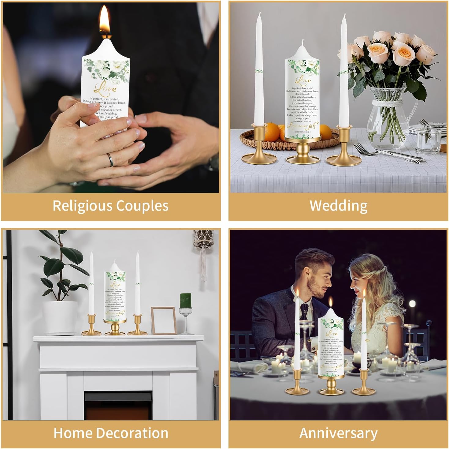 • 🕯️ Complete Unity Wedding Candle Bible Verse Set – This elegant unity candles for wedding ceremony set includes one large 8" pillar candle, two 10" taper candles and 3 gold candlestick holder, beautifully crafted for your most sacred moment.